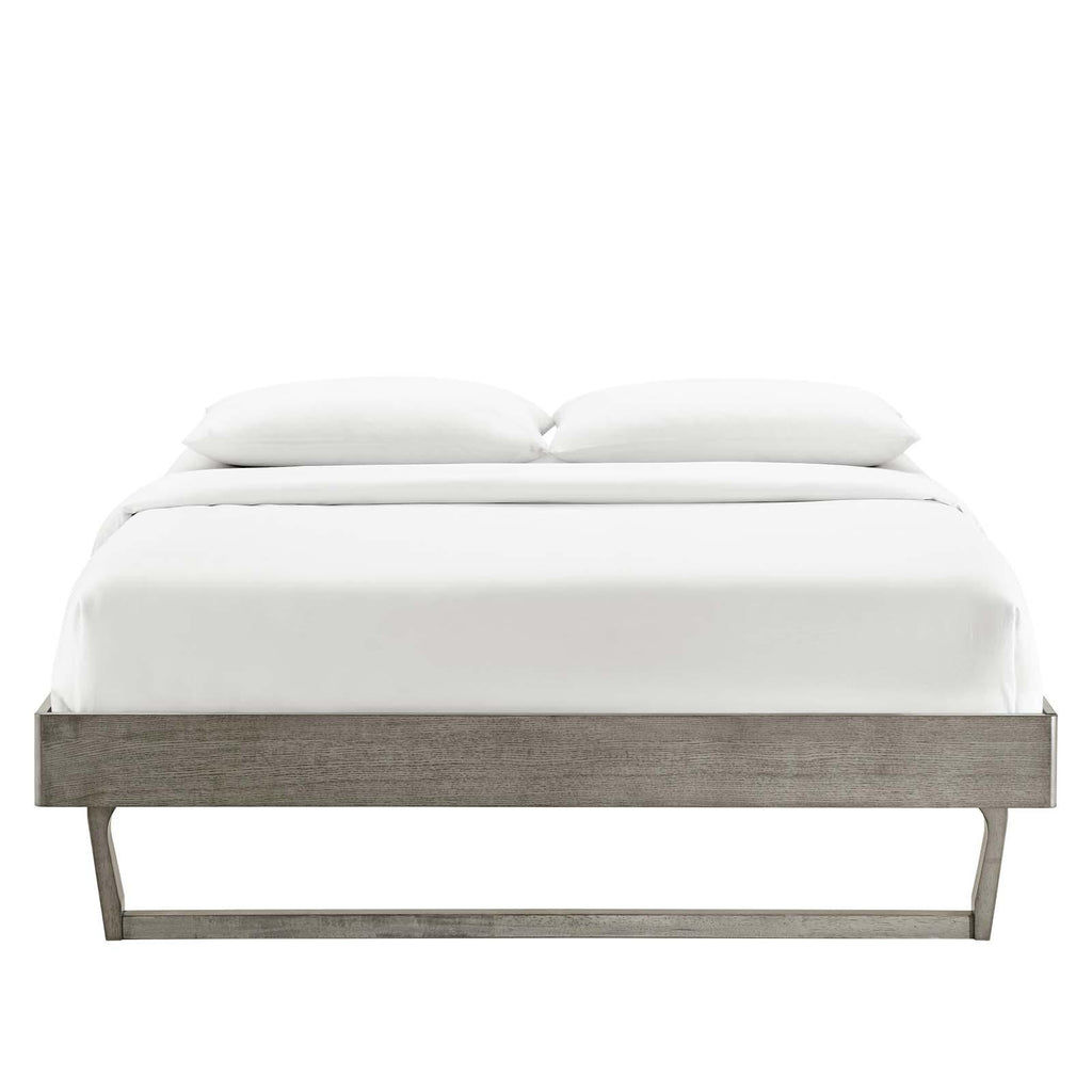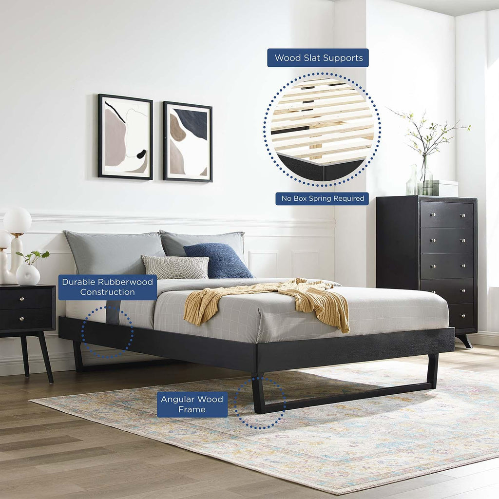 Set the stage for modern style and comfortable sleep with the Billie King Platform Bed. Inspired by mid-century design, this king size bed frame boasts retro detail with contemporary accents and organic aesthetics to bring trending modernity to your master bedroom or guest room. Adapting to any decor theme with the option of interchangeable headboards, this bed frame is compatible with the Robbie, Draper, Archie, and Collins headboard collections. This platform bed frame is a sturdy addition to the bedroom with a durable wood, MDF, and veneer construction and angular rubberwood legs. Eliminating the need for a box spring, this king bed is complete with a wood slat support system, reinforced center beam, and supporting legs that make it a lasting mattress foundation for memory foam, latex, innerspring, and hybrid mattresses. Assembly required. King Bed Frame Weight Capacity: 601 lbs.