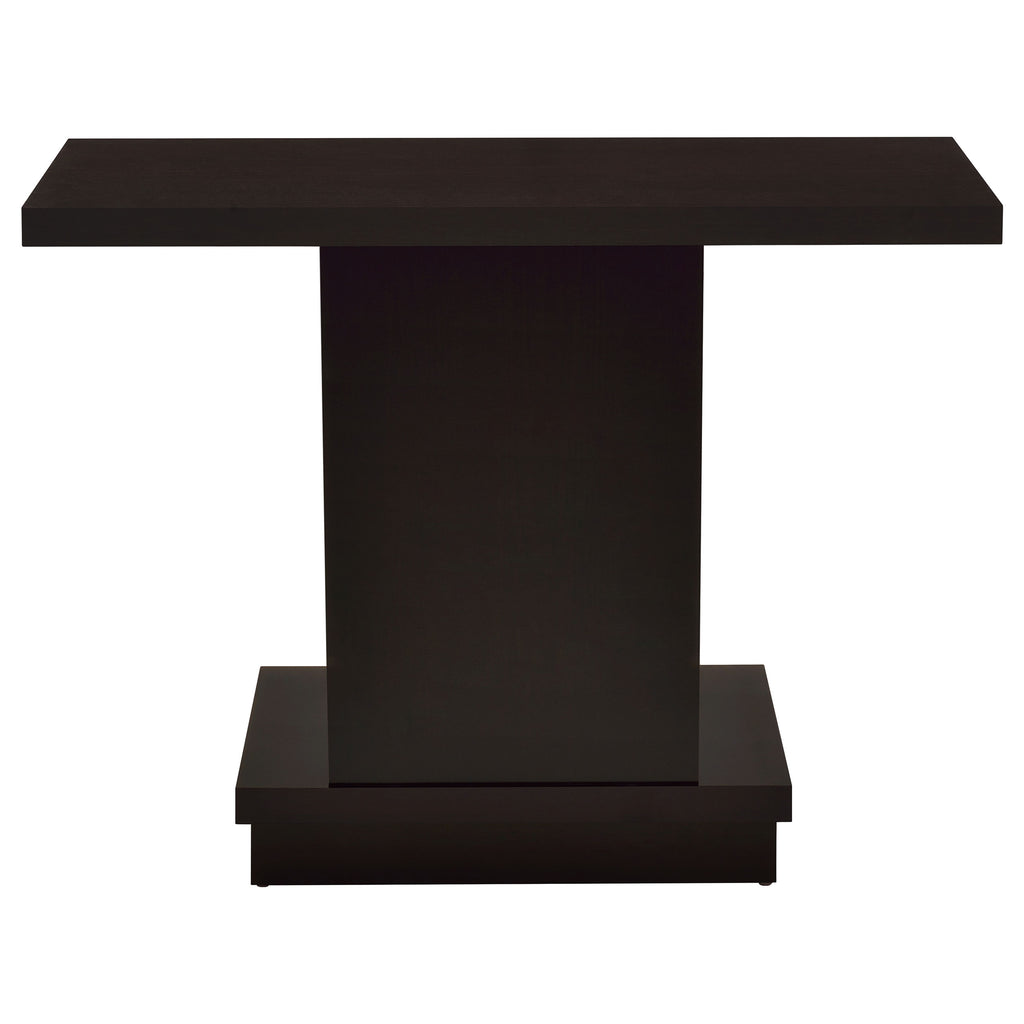 This sofa table delivers modern elegance with clean geometric lines and a versatile rectangular profile. Crafted from engineered wood with a scratch-resistant laminate veneer, it showcases a rich cappuccino finish that exudes contemporary charm. The spacious tabletop provides ample room for decor, storage, or everyday essentials. Perfect for use behind a sofa or in an entryway, this console table seamlessly blends style and functionality in any space. Key Features: • Sofa table with a sleek geometric design and clean, bold lines • Cappuccino finish adds warmth and contemporary elegance • Scratch-resistant laminate veneer ensures long-lasting appeal • Spacious tabletop offers plenty of room for decor or essentials • Engineered wood construction provides strength and durability • Ideal for placement behind a sofa or in entryways and hallways