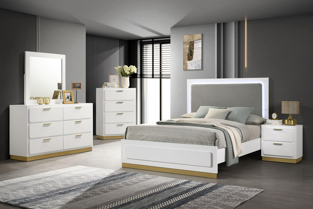 Modern luxury with a clean look offers a perfect fit for updated bedrooms as the bed anchors a sleek master suite or guest bedroom. Wood and wood products construct a bed with clean lines and an extra tall headboard that stands out to be noticed. Tech features fold LED strip lighting into its headboard, with a touch-activated light button on its front panel. This bed offers simplicity with sleek elegance, as straight legs and a headboard insert join a dimensional design element on its footboard. Choose this bed for its versatility and convenience, making a bedroom a haven for both sleep and serenity. Key Features: • A modern bed design adds crisp silhouetting with a high headboard and dimensional footboard design • This bed's high headboard and two-tone finish palette deliver a great style for modern spaces • Contrasting finishes and materials add an interesting effect to this contemporary bed • Enjoy headboard-mounted LED strip lighting for nighttime reading and visibility • Embrace the crisp, clean silhouette of a modern bed with linear styling and height variance