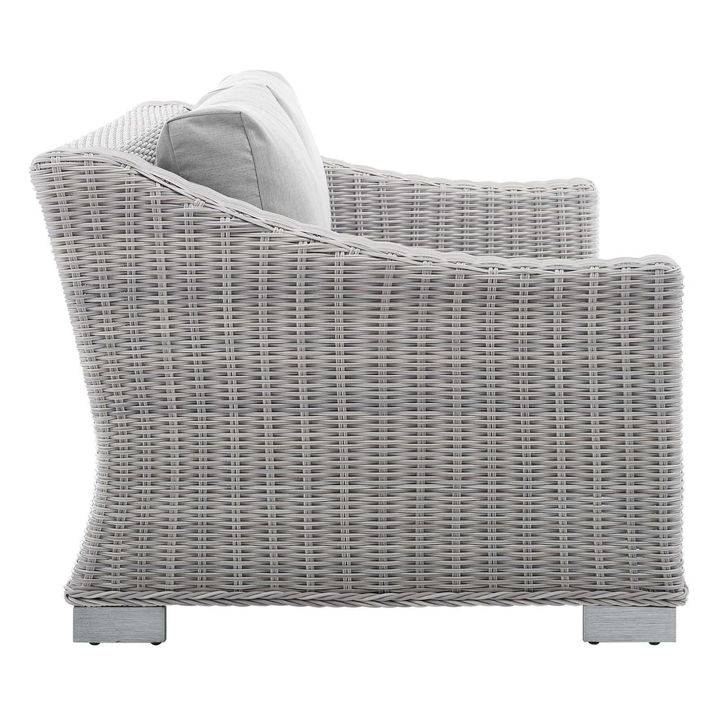 Enjoy fresh air and alfresco relaxation with the Conway Outdoor Patio Sunbrella� Wicker Rattan 4-Piece Furniture Set. Wrapped in UV-resistant light gray synthetic wicker rattan, this patio furniture set boasts organic texture and a neutral hue that brings a calming presence to your outdoor space. The frame of this outdoor furniture set and outdoor ottoman are crafted with durable powder-coated aluminum and rest on L-shaped legs with plastic foot glides. Thick foam padded cushions covered with washable water-resistant Sunbrella� covers offer a comfortable seat and affix securely to the lounge chair with cord tension attachments. Trending aesthetics and a classic design define this outdoor patio furniture collection making it a beautiful addition to any outdoor space including the backyard, patio, porch, balcony, or poolside. Assembly required. Set Includes: Sofa, Loveseat, Armchair, Coffee Table