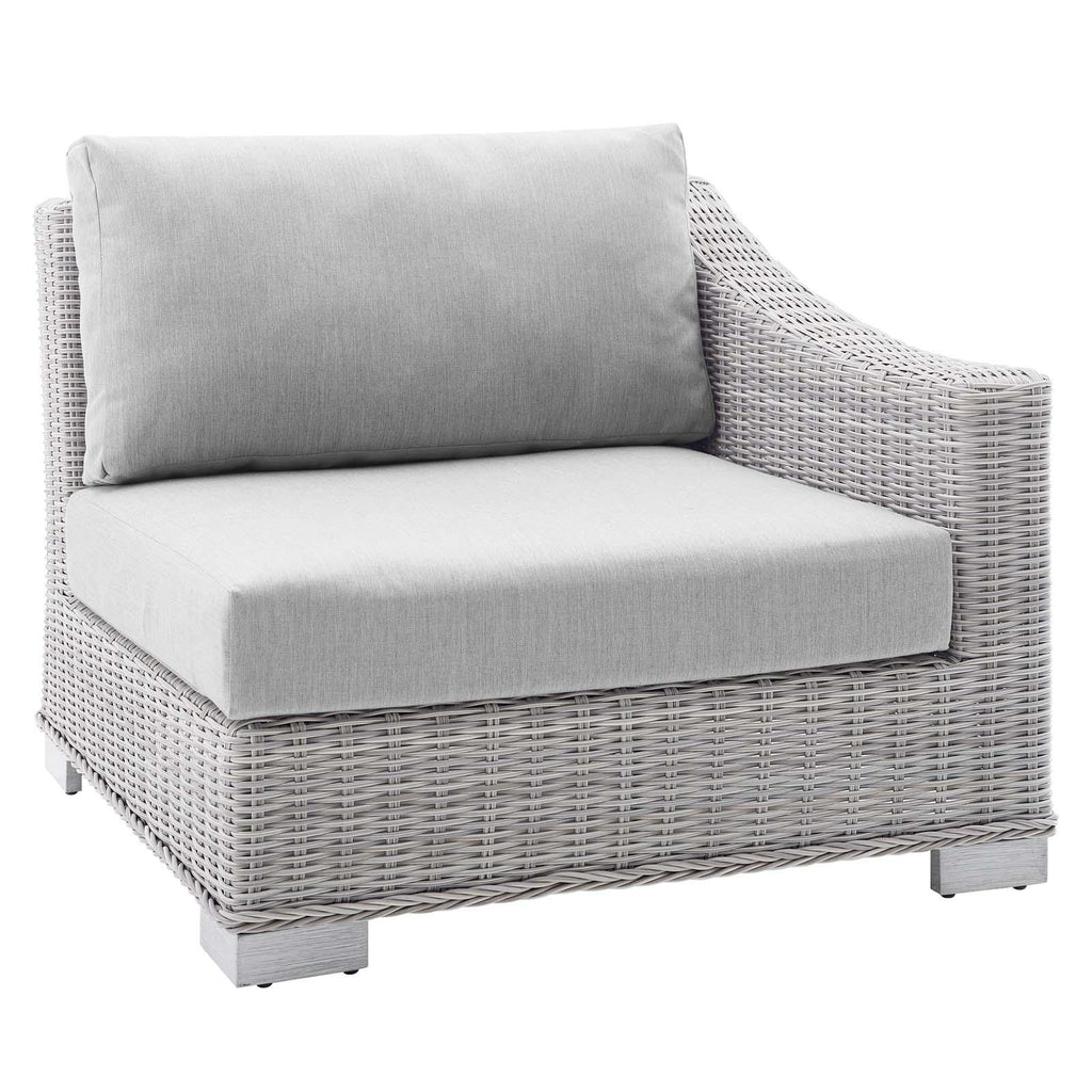 Enjoy fresh air and alfresco relaxation with the Conway Outdoor Patio Sunbrella� Wicker Rattan 9-Piece Sectional Sofa Furniture Set. Wrapped in UV-resistant light gray synthetic wicker rattan, this outdoor sectional sofa boasts organic texture and a neutral hue that brings a calming presence to your outdoor area with a modular design that adapts to variety of configurations to suit your space. The frames of this outdoor sofa set are crafted with durable powder-coated aluminum and rest on L-shaped legs with plastic foot glides. Thick foam padded cushions covered with washable water-resistant Sunbrella� covers offer a comfortable seat and affix securely to the patio sofa with cord tension attachments. Trending aesthetics and a classic design define this outdoor patio furniture collection making it a beautiful addition to any outdoor space including the backyard, patio, porch, balcony, or poolside. Assembly required. Set Includes: Corner Chair, Left-Arm Chair, Right-Arm Chair, 3 Armless Chairs, 2 Armchairs, Coffee Table