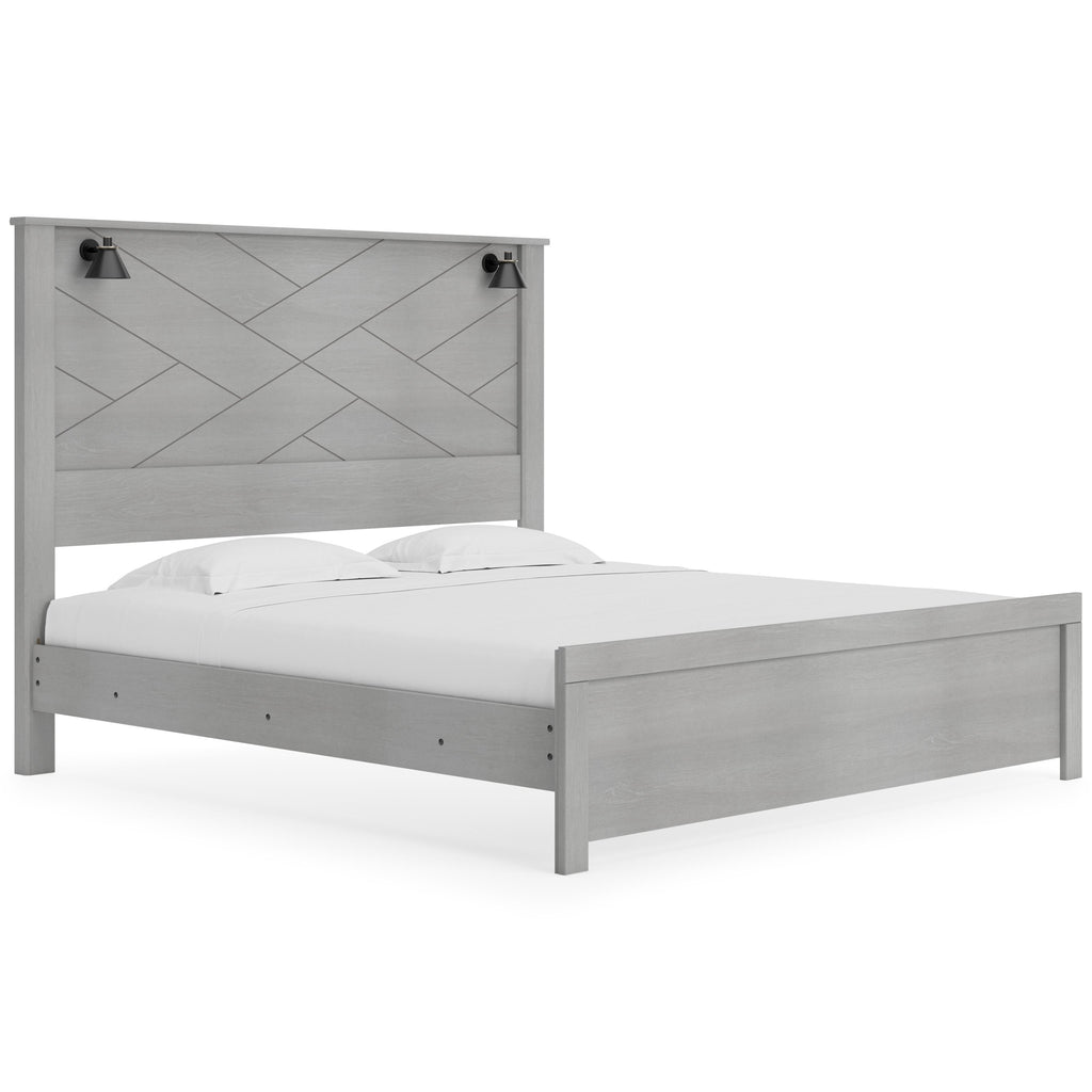 Cool, clean and casually modern. This bedroom set’s wispy dove gray finish sets the tone for your calming sanctuary. Framed elements and cross-brace accents add dimension and authenticity to the bed’s simply stunning profile. The storage pieces' large linear pulls and smooth-gliding drawers neatly accommodate your wardrobe and bedside storage needs.