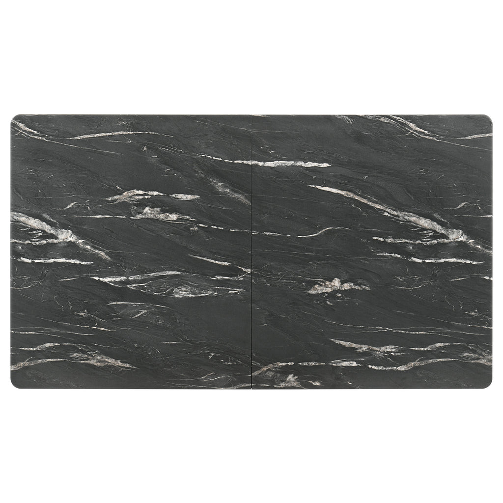 Envision your gatherings transformed with this exquisite dining set, where the sleek lines of modern design meet the timeless allure of faux marble. The table's luxurious black marble-esque top is a symphony of style, supported by fin-style legs that ground it with a touch of sophistication. As your ensemble grows with the seamless self-storing extension, the dining tableau adapts, offering a spacious stage for both feasts and intimate conversations. Accompanying the table, the Danish Y-shaped wishbone chairs, dressed in black and beige, whisper of coastal breezes and relaxed elegance, their form both a nod to tradition and a statement of contemporary grace. This dining set doesn't just host meals; it curates experiences. Key Features: • Elegant 5-piece dining set features a rectangular table with a striking faux marble top • Accommodates additional guests with a 16" self-storing leaf • Set includes six elegant wishbone side chairs in black with beige fabric cushions • The table's fin-style legs and chairs' tapered design provide a cohesive look • Both table and chairs boast durable construction, with materials chosen for longevity and ease of maintenance