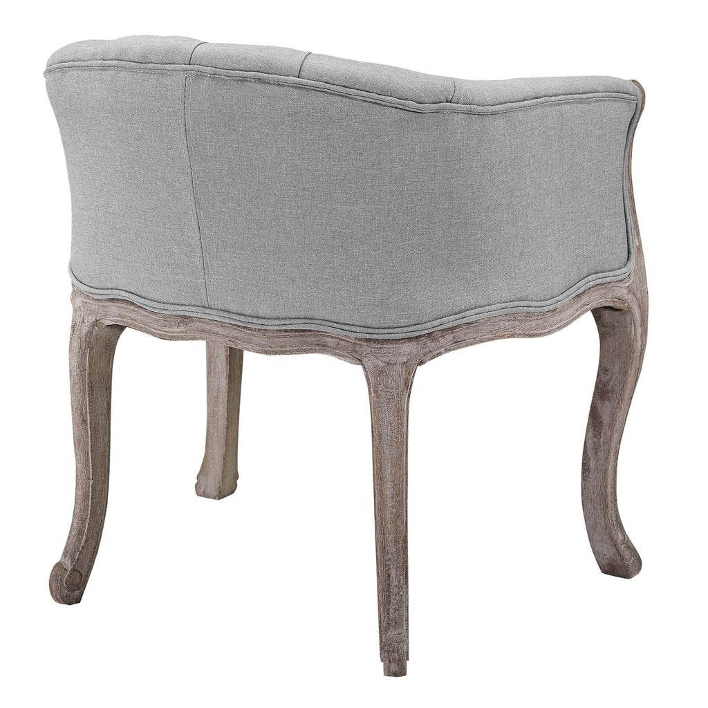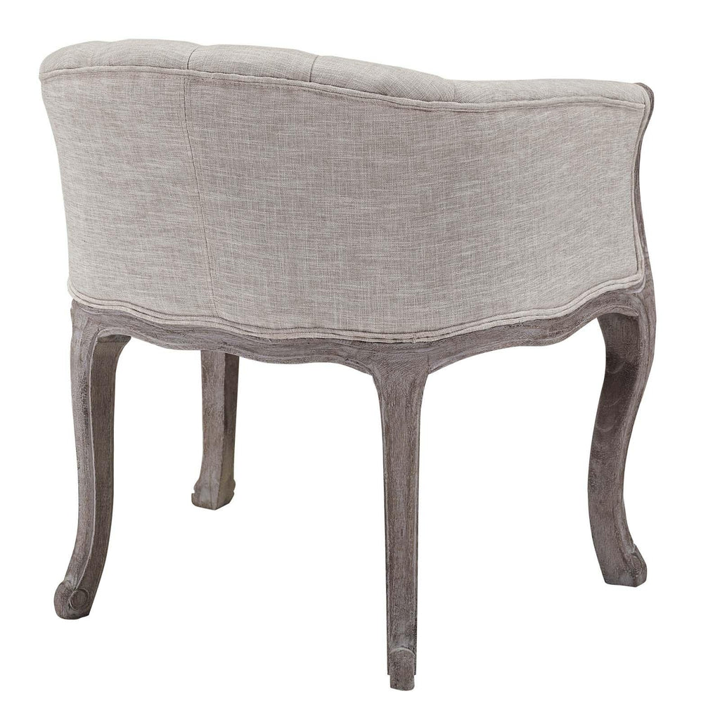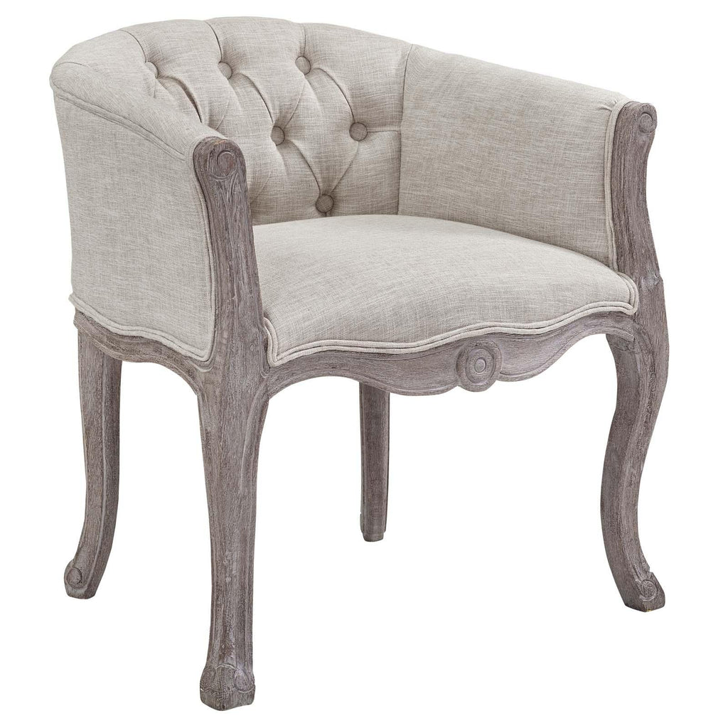 Revel in the whispered opulence of the Crown French Vintage Dining Accent Armchair. Featuring a fluted wood frame with elegant cabriole legs, dense foam upholstered fabric seat and backrest with welting and button tufting, this round barrel back dining armchair or accent chair harmoniously blends old world charm with modern farmhouse intrigue. Designed with a weathered vintage French look and an undeniable appeal, Crown Dining Armchair supports up to 331 pounds and comes with foot pads to preserve flooring. Comes fully assembled. Set Includes: Two - Crown Armchair Vintage French Dining Armchair Polyester Fabric Upholstery Round Barrel Back Design Dense Foam Padding Fluted Solid Wood Frame Elegantly Tufted Buttons Chair Weight Capacity: 331 lbs Overall Product Dimensions: 24.5"L x 24"W x 27.5"H Overall Armchair Dimensions: 24.5"L x 24"W x 27.5"H Seat Dimensions: 18"W x 18"H Armrest Dimensions: 24.5"L x 24.5"H