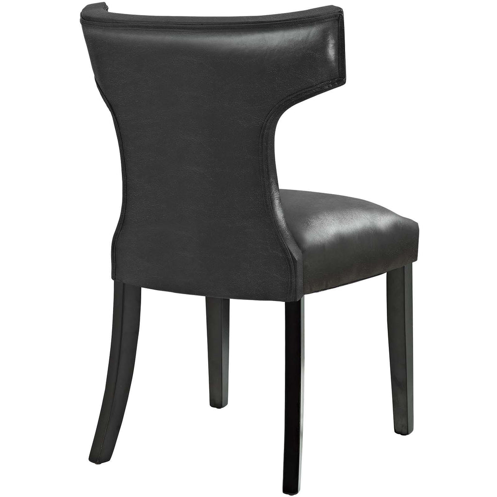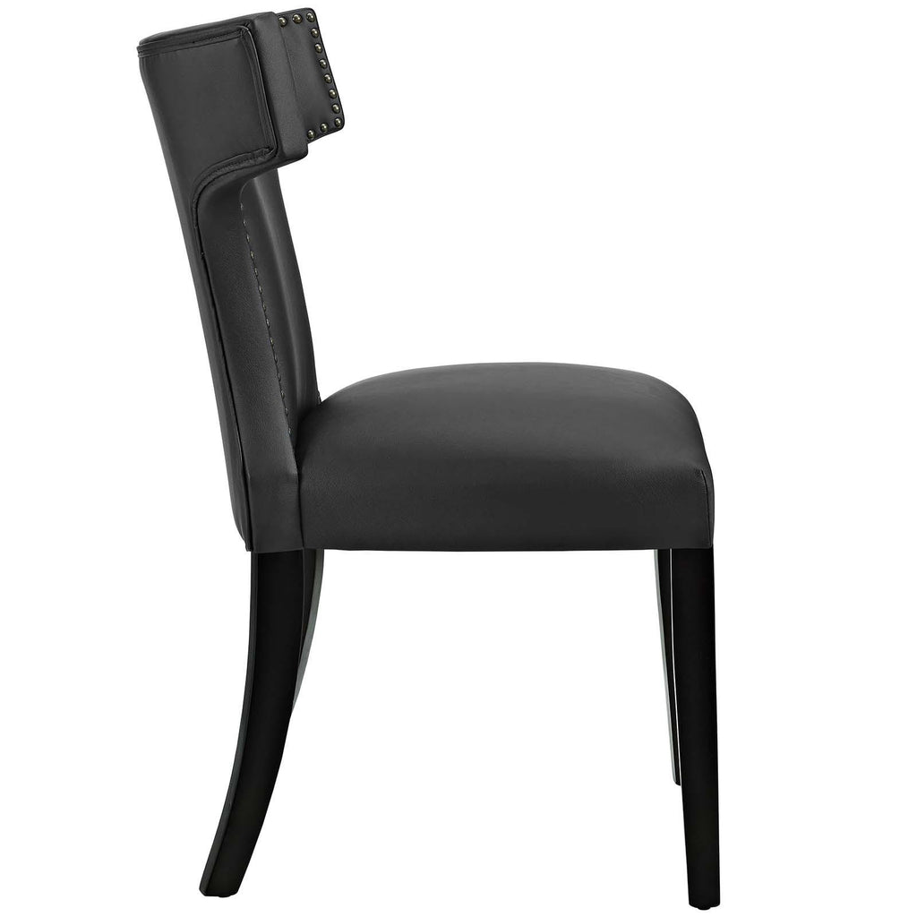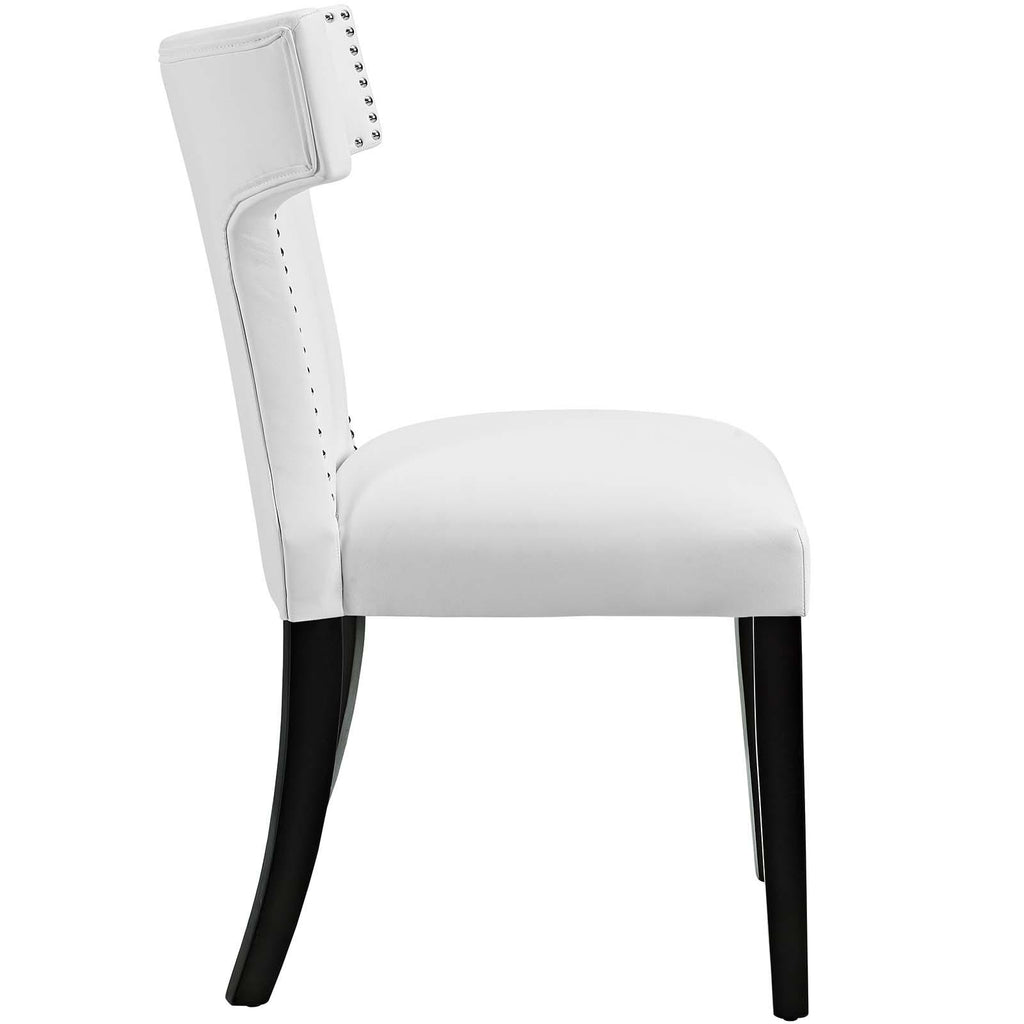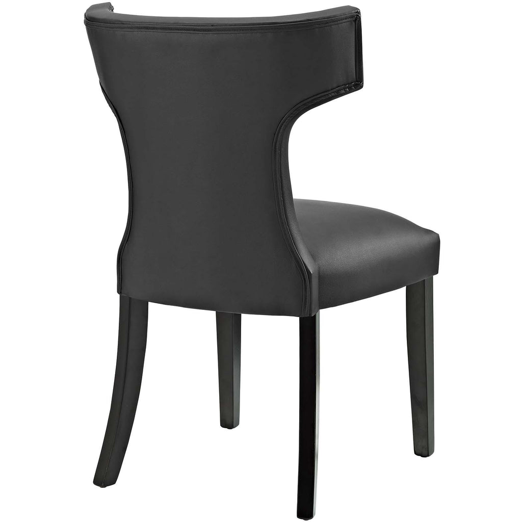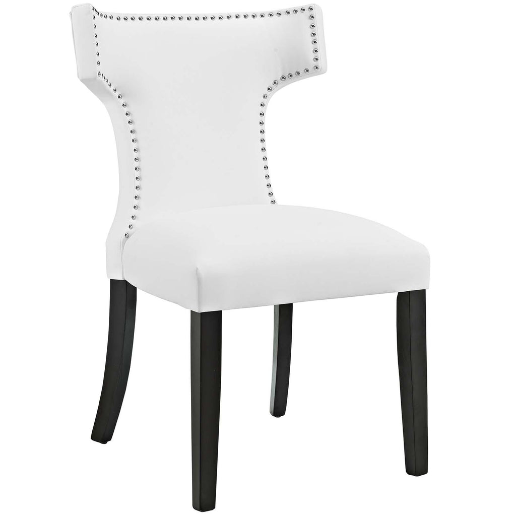Transform your dining d�cor with the broadly designed Curve Dining Side Chair. Sweeping lines complement a minimalist shape for a chic look studded with nailhead trim. Curve comes generously padded with dense foam covered in vinyl, non-marking foot caps, and delivers just the right touch of finesse with tapered wood legs. Sporting an hourglass shape, Curve works well in a variety of dining room arrangements.