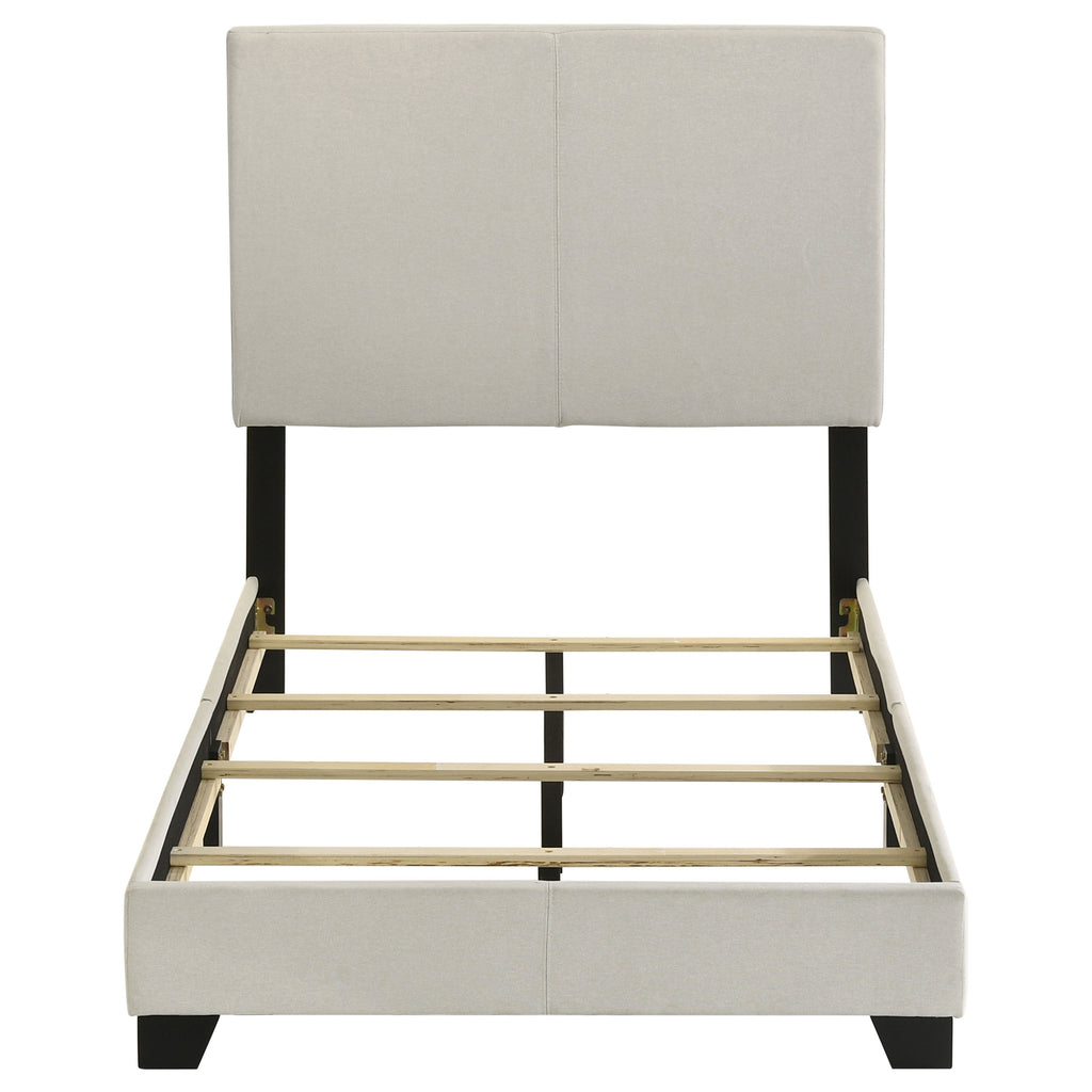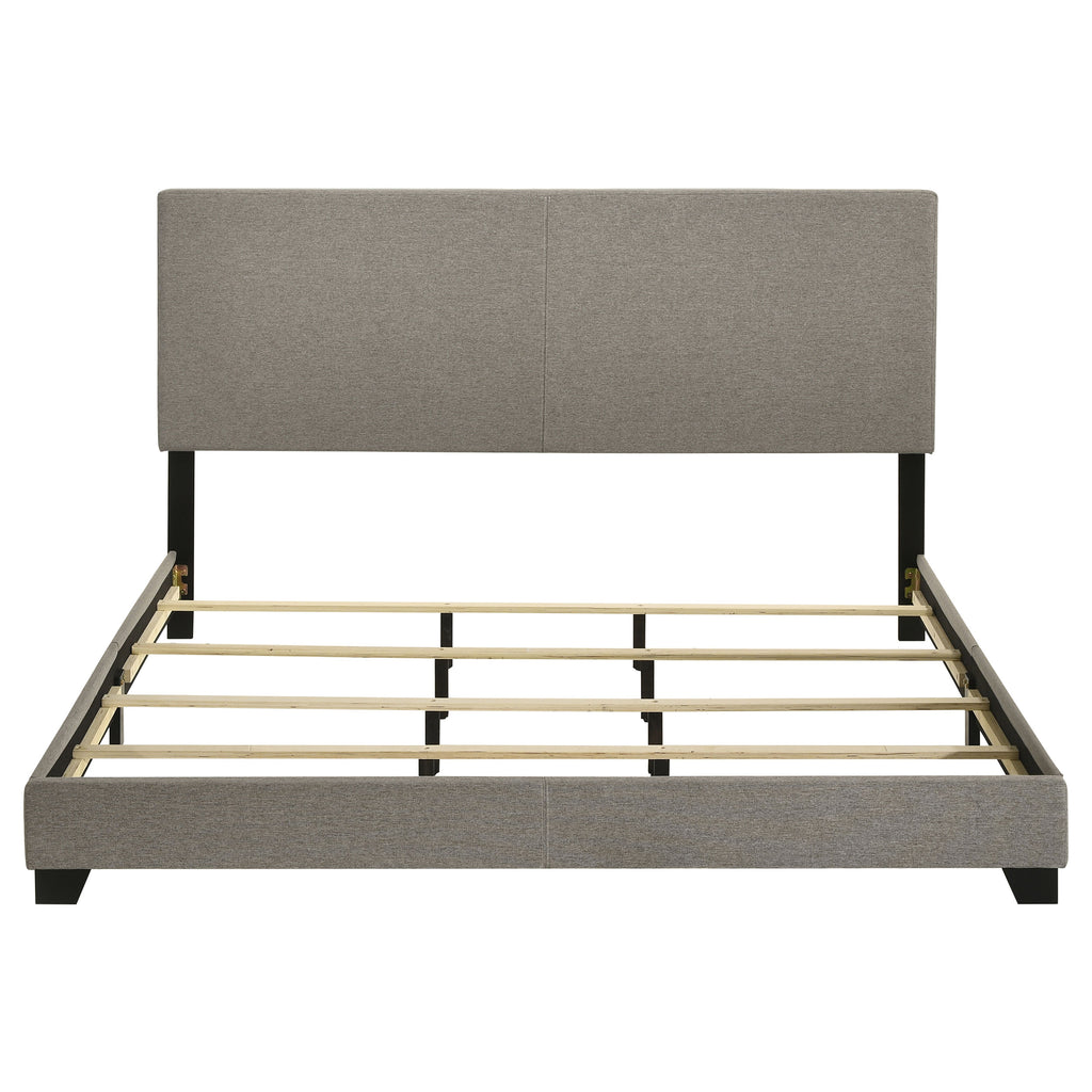 Transform your bedroom with this versatile panel bed, available in both faux leather and fabric upholstery options to suit any decor. Featuring a padded headboard and sleek design, it offers modern elegance and everyday comfort. Crafted with rubberwood, engineered wood, and foam, it ensures durability, while solid wood legs in a black finish add stability and a refined touch. The platform construction eliminates the need for a box spring, making it both stylish and functional. Key Features: • Queen bed upholstered in brown faux leather upholstery • Padded headboard provides comfort and a sleek aesthetic • Sturdy construction with rubberwood, engineered wood, and foam • Solid wood legs in a black finish add a refined touch • Platform design supports your mattress without a box spring • Versatile design complements various bedroom layouts and styles