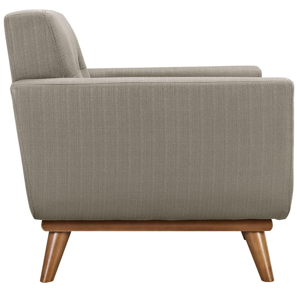 Gently sloping curves and large dual cushions create a favorite lounging spot. Whether plopping down after a long day at work, settling in with coffee and brunch, or entering a spirited discussion with friends, the Engage armchair is a welcome presence in your home. Seven tufted buttons create eye-catching appeal, adding depth that brings your sitting d�cor to center stage. Four cherry color rubberwood legs and frame supply a solid base to the comfortable upholstered material.
