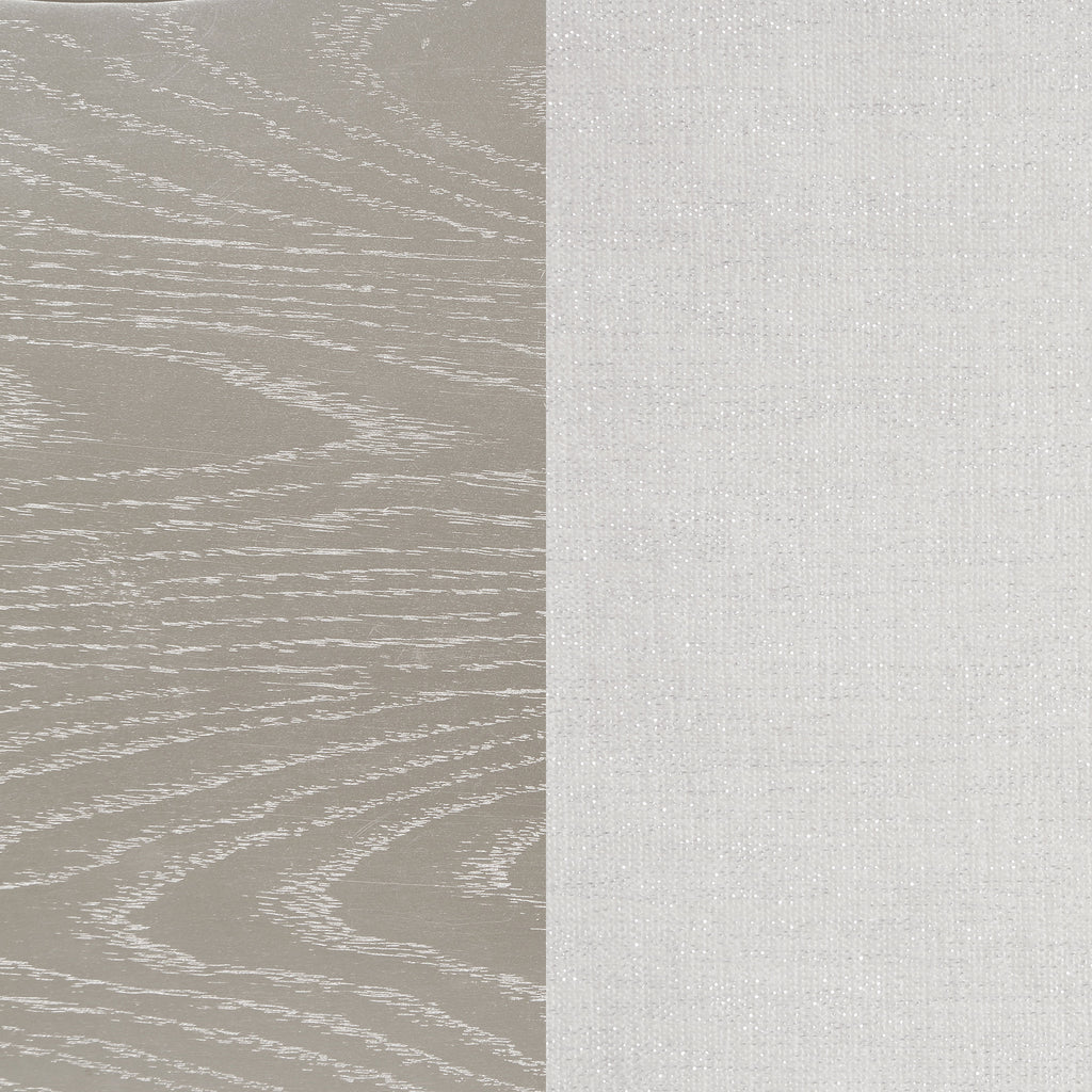 Elevate your restful bedroom retreat with this elegant, glam platform bed. A curvy double arch headboard and footboard are designed with a padded insert of flared channel tufting that lends an eye-catching motif. Each padded piece is upholstered in a soft, ivory fabric that lends a neutral color palette. A silver oak finished frame gives off a chic pearlescent look and feel, accented by glittering panels that rest flush between the crown molding and trim details throughout. Slender, tapered legs offer a subtle lift, allowing for extra storage beneath. Key Features: • Double arch head and footboards feature ivory fabric upholstery with foam padding • Glittering accent panels bring sparkling sophistication to any bedroom • Silver oak finish is elegant and modern, delivering a glam finishing touch • Elegant trim details and channel tufting emphasize graceful curves • Complete with wide rails and tapering legs for a sleek stance