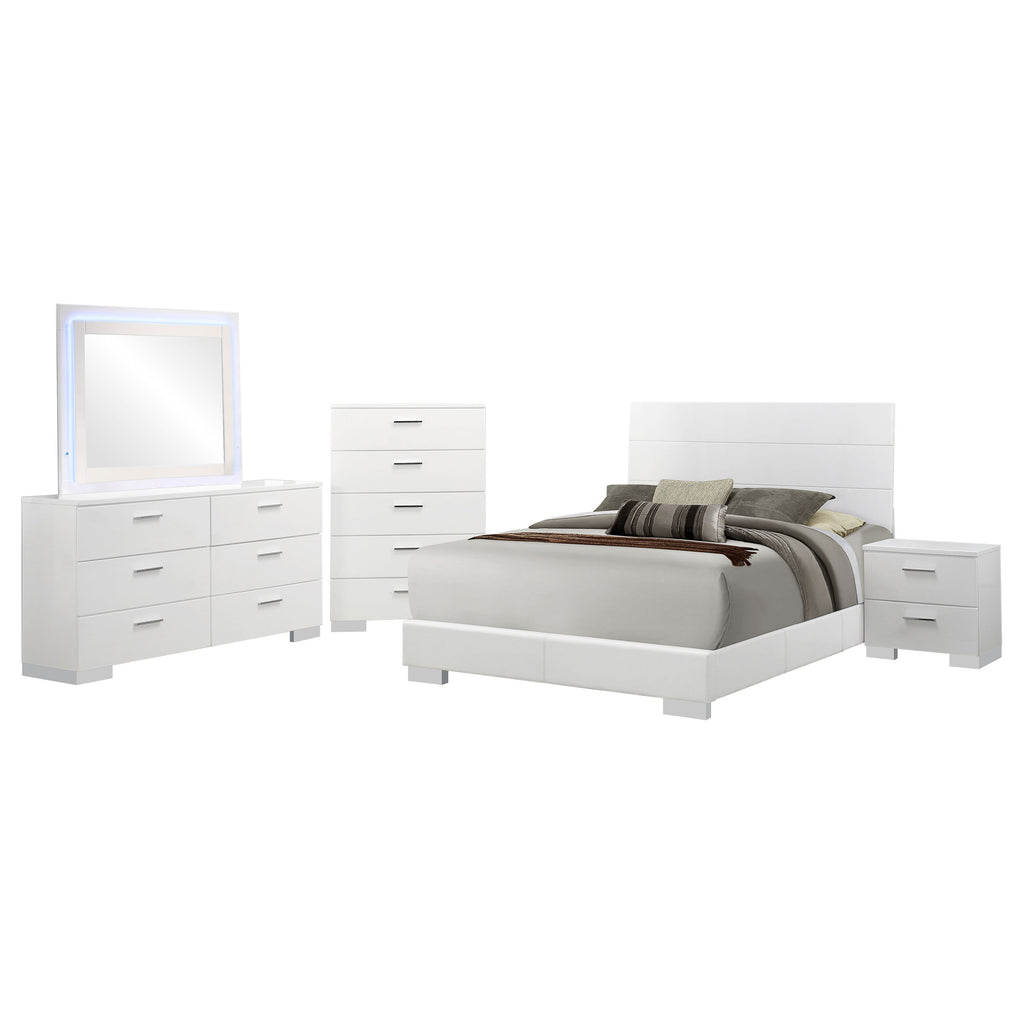 Elevate your bedroom with the sleek sophistication of this contemporary bedroom set. The panel bed features a clean-lined white high gloss headboard and a faux leather upholstered frame, delivering a refined yet modern aesthetic. Chrome-finished accents add a polished touch, while smooth-gliding drawers ensure effortless functionality. Designed for both style and durability, this set brings a fresh, minimalist feel to any space. Key Features: • Modern bedroom set showcasing a sleek and minimalist panel bed design • White high gloss headboard provides a clean, polished, and contemporary look • Bed frame upholstered in smooth, durable, and soft faux leather for comfort • Storage pieces feature spacious drawers with smooth metal extension glides • Chrome-finished metal handles and feet enhance the sleek, modern aesthetic • Designed for long-lasting durability while offering everyday functionality