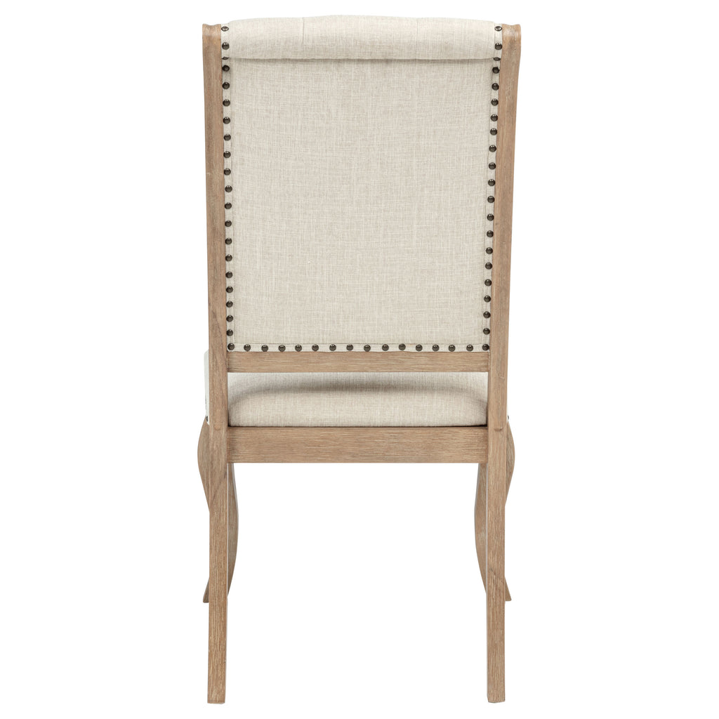 Graceful and inviting, this upholstered dining chair pairs timeless design with modern comfort. The gently curved legs and tufted backrest create a refined silhouette, while bronze nail head trim adds a subtle touch of sophistication. Its cream-toned upholstery offers a soft, neutral contrast to the barley brown wood frame. Crafted from solid rubberwood and foam cushioning, this elegant side chair combines durability and plush comfort, perfect for both formal dining occasions and daily family meals. Key Features: • Dining chair features upholstered seat and button tufted back for classic elegance • Smooth barley brown finish pairs beautifully with soft cream fabric upholstery • Bronze nail head trim outlines the frame for a refined, tailored appearance • Curved front and back legs enhance the transitional silhouette with graceful charm • Constructed from solid rubberwood with foam padding for comfort and durability • Perfect addition to dining spaces offering both timeless beauty and everyday comfort