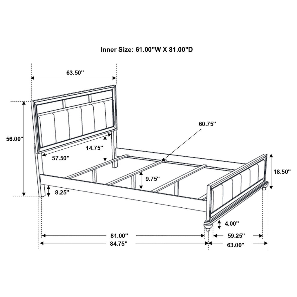 Infuse your bedroom with sleek sophistication and subtle glam with this panel bed. A tall headboard and matching footboard feature channel tufted panels wrapped in metallic leatherette, creating a striking focal point. The crisp white frame is detailed with molding for depth and finished with turned feet for timeless charm. Sparkling accents add a touch of radiance, while the bed is crafted from solid rubberwood, engineered wood, and okume veneer for strength and durability in everyday use._x000D_ Key Features: • Queen panel bed with white finish and glamorous metallic leatherette panels • Tall headboard and low footboard feature channel tufting for sleek dimension • Molded frame edges add depth and refined detail to the bed’s classic profile • Sparkling accent trim enhances the bed with a radiant and stylish touch • Crafted with solid rubberwood, engineered wood, and okume veneer materials • Turned bun feet complete the look with timeless and elegant design appeal