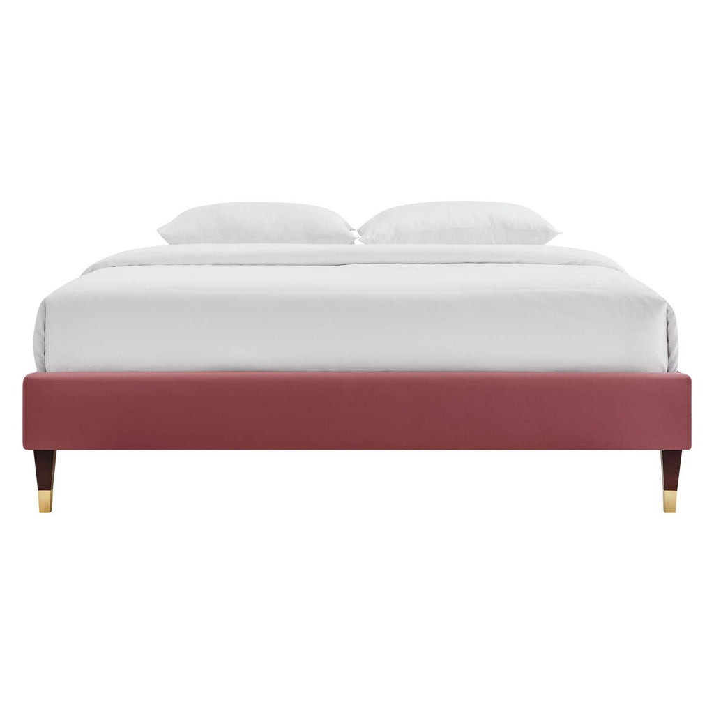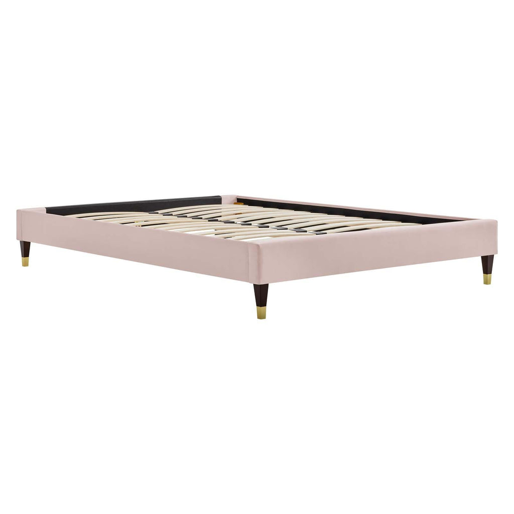 Bring glam deco style and luxurious sleep to your master bedroom or guest bedroom with the Harlow Performance Velvet King Bed Frame. Resting atop wood legs with gold metal sleeves, the side rails of this platform bed are covered in soft, stain-resistant performance velvet offering rich texture to the simple design. This king size bed frame is a sturdy mattress foundation for memory foam, innerspring, latex, and hybrid mattresses. With supporting legs and a reinforced center beam, this upholstered bed is complete with a poplar wood slat support system that offers lasting stability. Compatible with a variety of king headboard designs, this king platform bed also makes a statement as a stand-alone piece. Mattress not included. Assembly required. King Bed Frame Weight Capacity: 800 lbs.