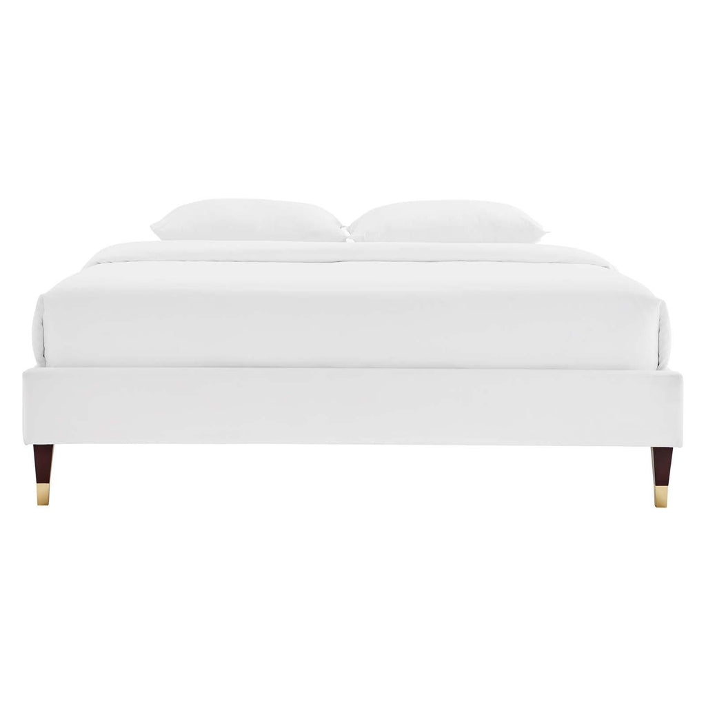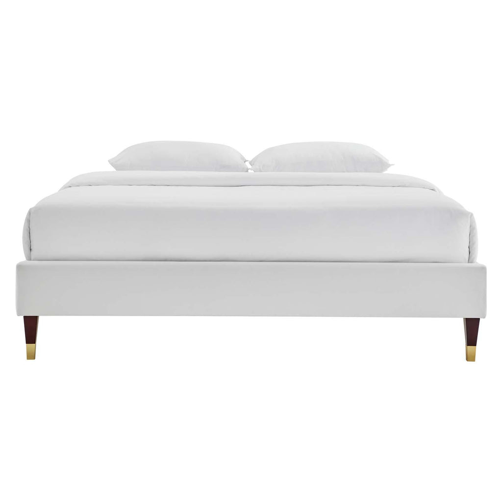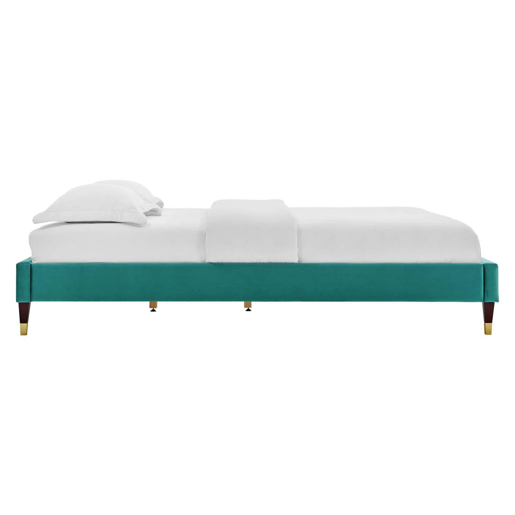 Bring glam deco style and luxurious sleep to your master bedroom or guest bedroom with the Harlow Performance Velvet Queen Bed Frame. Resting atop wood legs with gold metal sleeves, the side rails of this platform bed are covered in soft, stain-resistant performance velvet offering rich texture to the simple design. This Queen size bed frame is a sturdy mattress foundation for memory foam, innerspring, latex, and hybrid mattresses. With supporting legs and a reinforced center beam, this upholstered bed is complete with a poplar wood slat support system that offers lasting stability. Compatible with a variety of Queen headboard designs, this Queen platform bed also makes a statement as a stand-alone piece. Mattress not included. Assembly required. Queen Bed Frame Weight Capacity: 800 lbs.