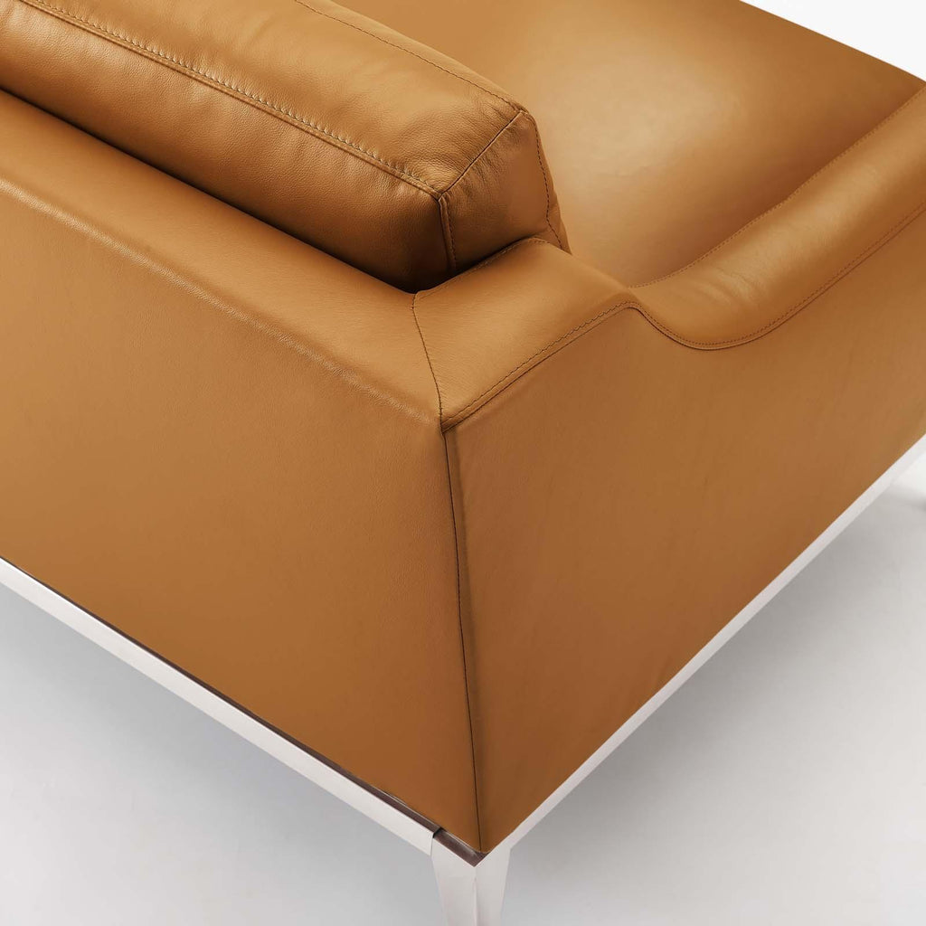 Center your space with the Harness Leather Armchair. Featuring soft leather upholstery, Harness comes with a dense foam padded seat cushion, supportive cotton-filled back pillow, a sinuous spring support system, and a polished stainless steel frame with non-marking foot caps. Perfect for the living room, bedroom or entryway, this streamlined accent lounge armchair fuses modern intrigue with timeless appeal for a sleek low-profile chair that completes the look of any vintage or contemporary modern home or apartment. Cushions remove for easy cleaning. Chair Weight Capacity: 300 lbs.