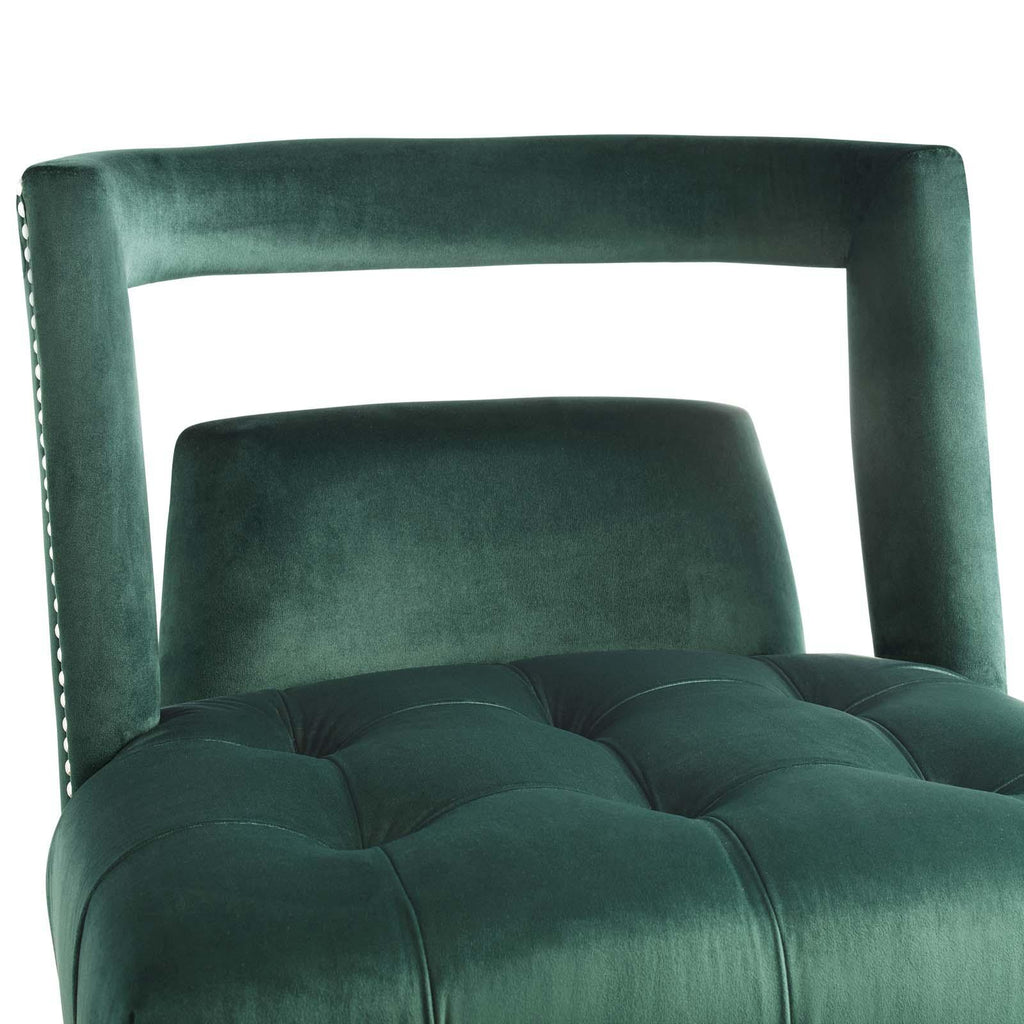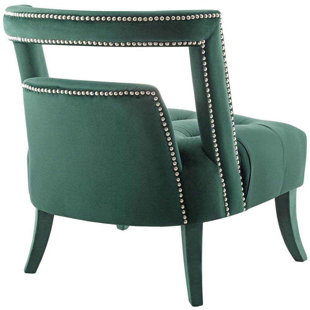 Make a statement with the visually impactful Honor Performance Velvet Accent Lounge Armchair. Honor's cut-away open design gives way to a plush seat cushion with dense foam padding for a premium seat experience. An elegant accent chair, Honor comes upholstered in soft, stain-resistant performance velvet fabric with deep biscuit tufted buttons and nailhead trim for a rich, timeless look. Supported on four splayed velvet upholstered wood legs, add luxury comfort to your living room, entryway, bedroom or lounge area with this cozy accent chair. Includes non-marking foot caps and supports up to 300 lbs.