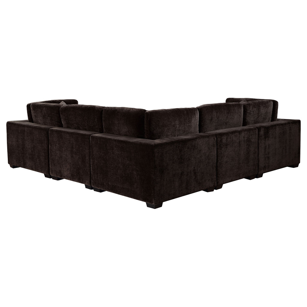 Sink into comfort with a modern, modular sectional sofa with an included ottoman. Plush cushions create exceptional comfort and support, wonderful for lounging or catching up with friends. The sectional displays an on-trend silhouette complete with wide track arms and block feet. The velvety soft upholstery is the perfect choice for a family room, creating a cozy ambiance. Its color palette is modern and versatile, easily complementing a variety of spaces and surrounding decor motifs.