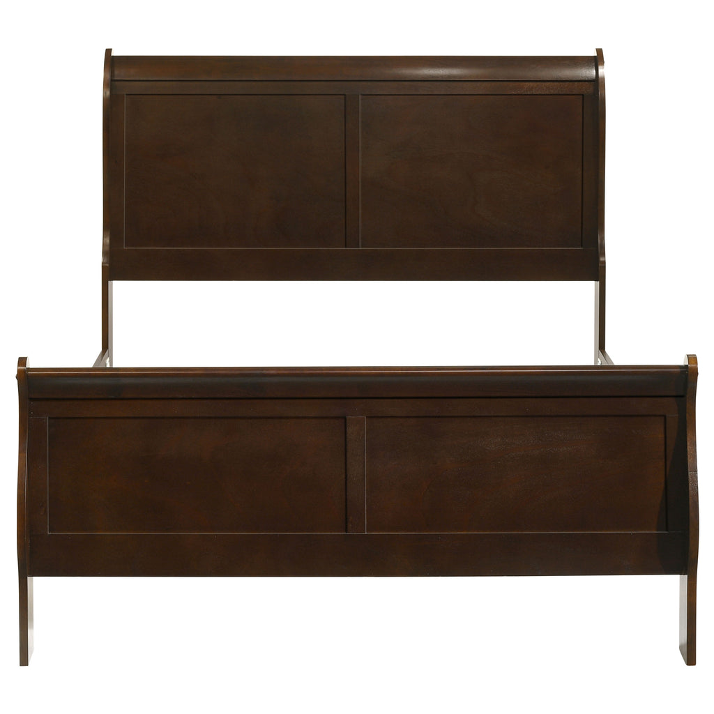 Thin, clean lines and geometric shapes make this full size bed great for any modern space. Constructed of wood veneer and select hardwoods, the frame features elongated and beveled edges in a warm cappuccino finish. With a footboard matching a slightly higher headboard, the silhouette is a perfect example of classic louis Philippe style. Full of depth, the wood reveals a slightly exposed wood grain. Walk the line between contemporary shape and traditional hues.