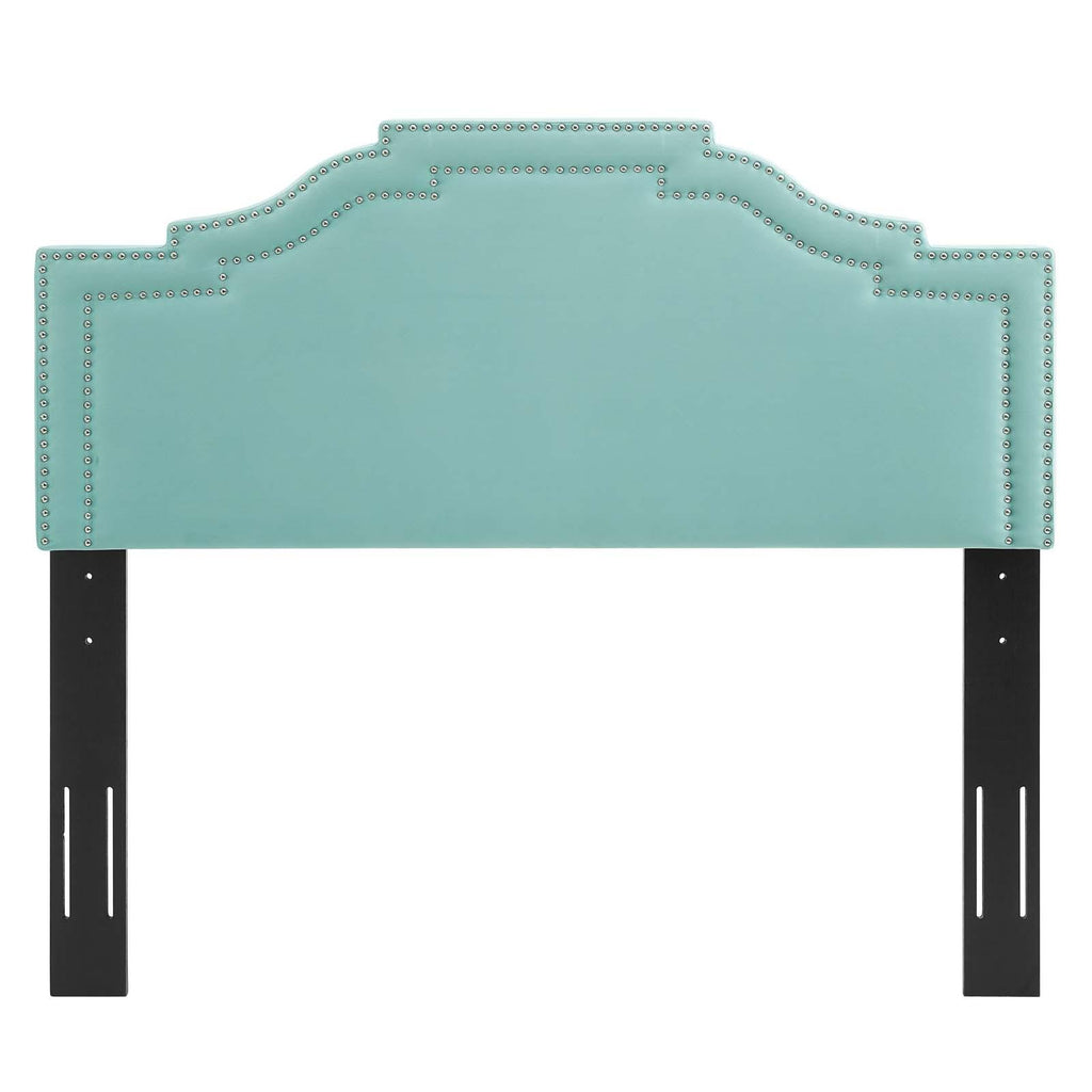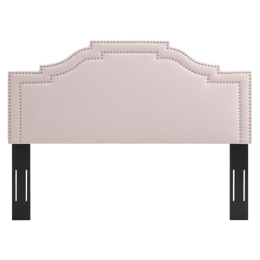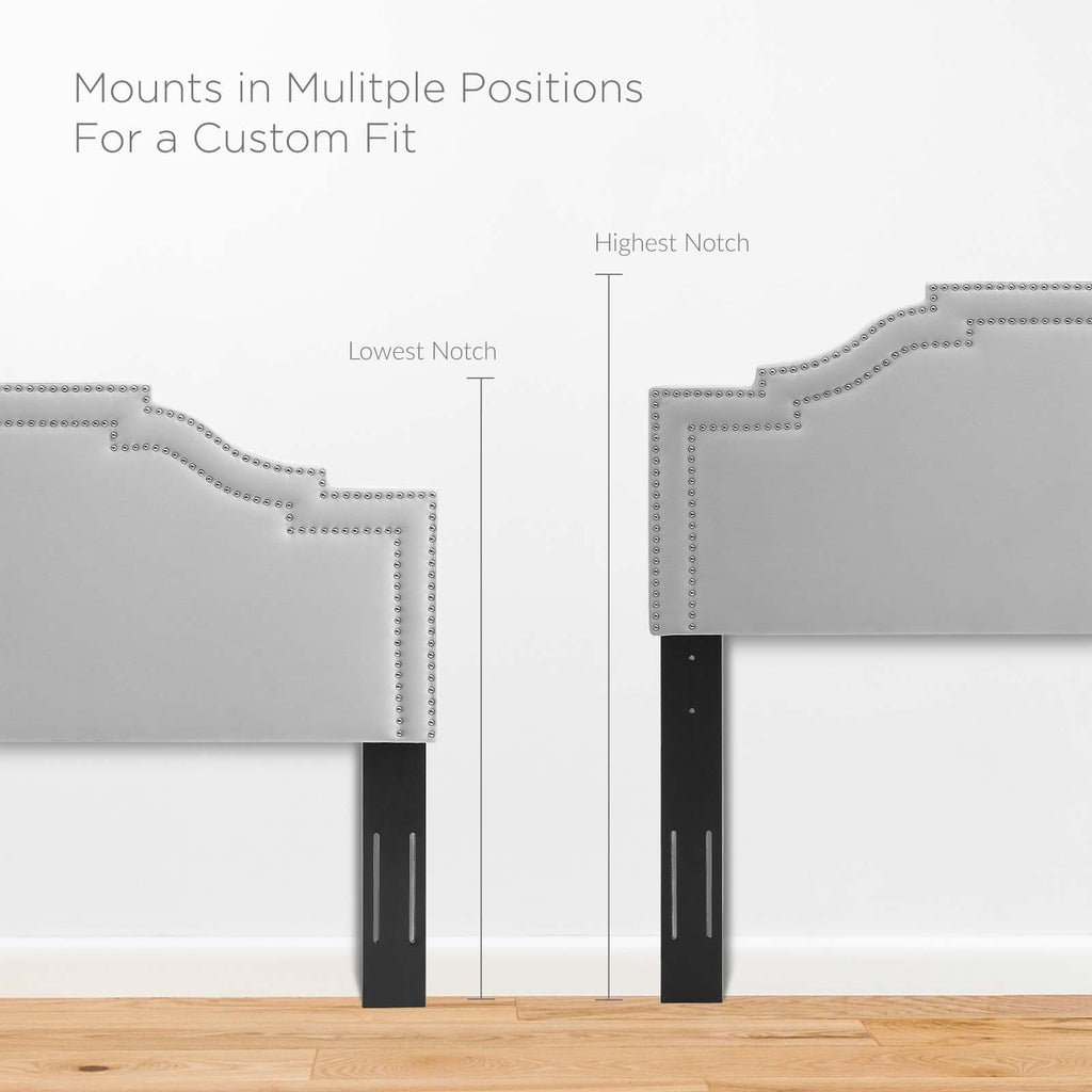 Influence glam deco style in a master bedroom or guest suite with the Lucia Performance Velvet King/California King Headboard. Featuring a double trim of nailheads and a unique arched shape, this velvet headboard brings tactile luxury to the bedroom. Covered in soft, stain-resistant performance velvet, this king/Cali king size headboard is padded in dense foam offering a supportive place to rest while sitting up in bed. A backdrop for a variety of bedding and sham styles, this height-adjustable headboard fits king or California king size bed frames with its three mounting positions. Assembly required.
