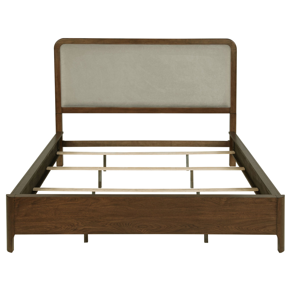 Center your bedroom retreat on the understated style of this transitional bed with an upholstered headboard. It's a refined choice that pairs wooden construction with walnut veneer, creating the perfect dose of warmth and character. The bed boasts a rounded corner headboard, complete with padding and taupe upholstery for both comfort and style. The bed is defined with a clean-lined silhouette, complete with a footboard level with its rails, delivering airy, open ambiance. Choose the perfect linens to create the bedroom of your dreams.