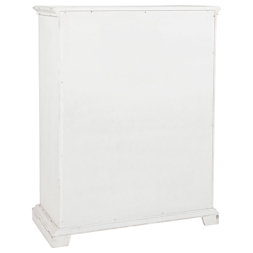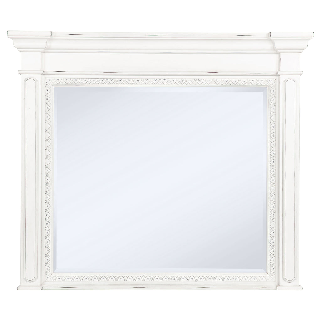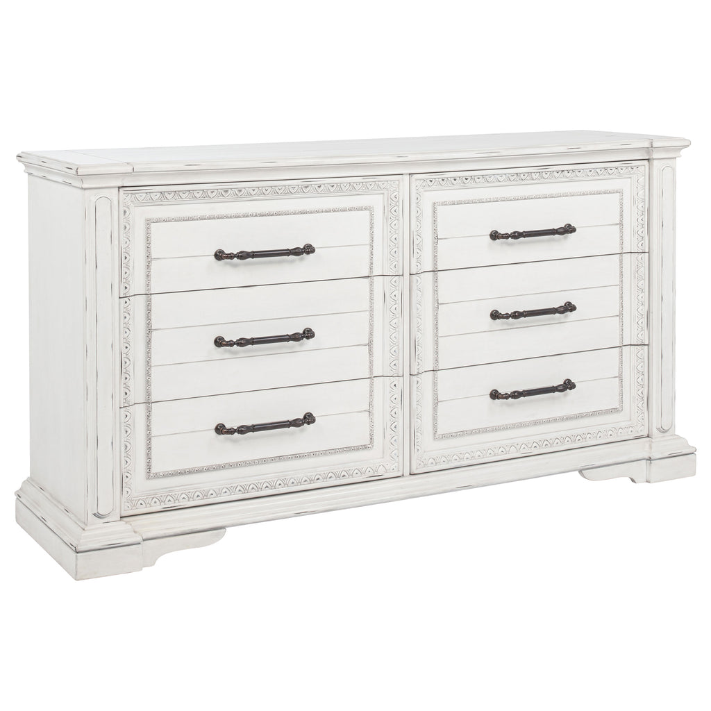 Steeped in elegance and shaped by thoughtful detail, this bedroom set captures the charm of timeless design. Crown moldings and carved accents highlight each piece, softened by a vintage white finish that whispers of age and grace. Hidden features like dual reading lights and jewelry trays offer modern convenience, while traditional construction ensures lasting durability. Crafted from poplar and engineered wood, the set brings classic character to restful spaces. Key Features: • Bedroom set with carved moldings, ornate trim, and traditional architectural elements • Vintage white finish brings a distressed look with soft, antique-inspired appeal • Select pieces include dual LED reading lights and hidden jewelry storage trays • Top drawers are felt-lined and glide smoothly with durable internal construction • Five-sided English dovetail drawers provide strength and full interior access • Crafted from poplar, MDF, and veneer for lasting beauty and classic refinement