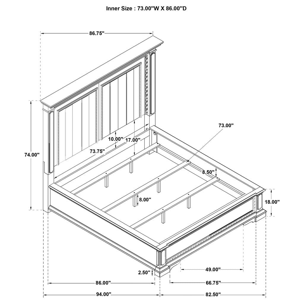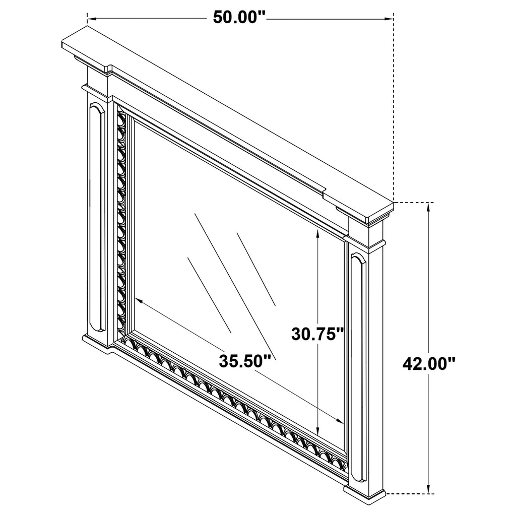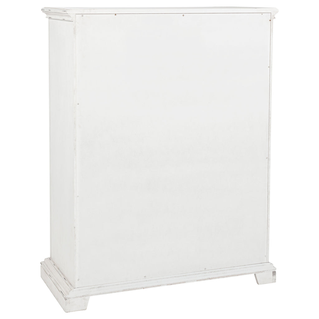 Steeped in elegance and shaped by thoughtful detail, this bedroom set captures the charm of timeless design. Crown moldings and carved accents highlight each piece, softened by a vintage white finish that whispers of age and grace. Hidden features like dual reading lights and jewelry trays offer modern convenience, while traditional construction ensures lasting durability. Crafted from poplar and engineered wood, the set brings classic character to restful spaces. Key Features: • Bedroom set with carved moldings, ornate trim, and traditional architectural elements • Vintage white finish brings a distressed look with soft, antique-inspired appeal • Select pieces include dual LED reading lights and hidden jewelry storage trays • Top drawers are felt-lined and glide smoothly with durable internal construction • Five-sided English dovetail drawers provide strength and full interior access • Crafted from poplar, MDF, and veneer for lasting beauty and classic refinement