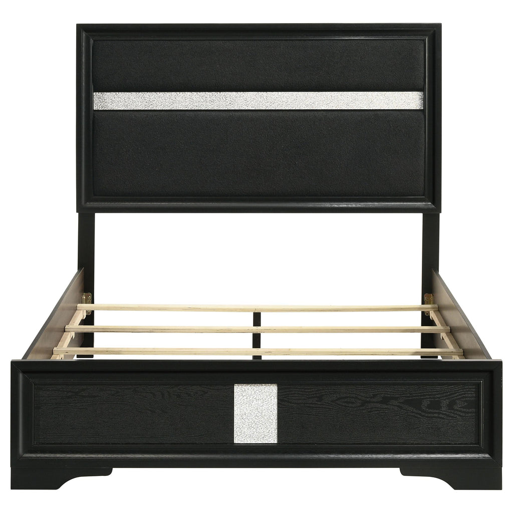 Introduce a little bit of glam flair to your bedroom with a modern upholstered bed. Featuring padded white fabric panels, the headboard is complete with molded trim and a horizontal stripe that glitters in the light. A matching vertical stripe on the low footboard is the perfect complement. A white finish is lightly textured on the panel footboard and rails, while trim is smooth and cool. The bed is complete with slats and center legs for added support and requires a foundation.