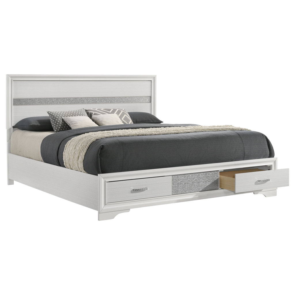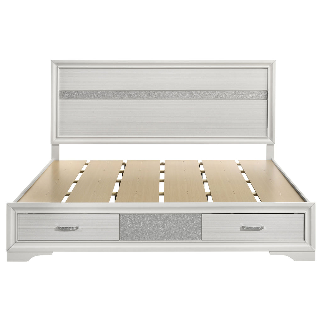 This alluring bed from the Miranda collection has both fashion and function. It features crisp lines and a headboard that's as simple as it is impressive. The footboard is built with two roomy drawers to hold extra sheets and blankets. The bed has an effortless timelessness and elegance. Add to the bedroom for a charming ambiance that's sure to please. Key Features: • Storage panel bed with integrated drawers in footboard design • Fully slatted platform eliminates need for separate foundation • Crystal-accent drawer pulls enhance the glamorous styling • Glitter trim accent at headboard and footboard adds visual interest • Bracket-style feet and beveled framing for a classic profile • Crafted with engineered wood in a bright white laminate finish