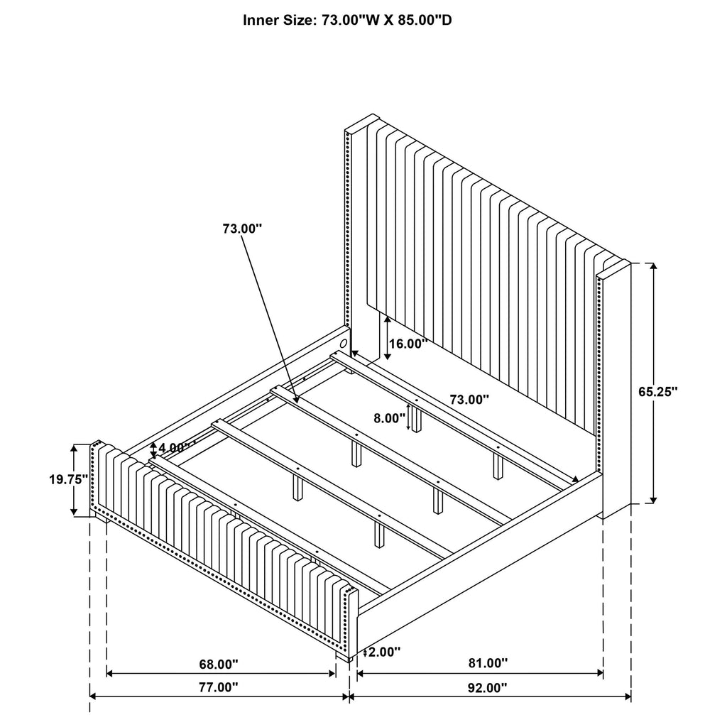 Instill luscious decadence with a modern glam upholstered bed. Cream fabric over plush foam cushioning creates a lush look and impeccable comfort when lounging. The bed is defined with its tall, wingback headboard, which boasts vertical channel tufting for the perfect hint of texture and depth. Nailhead trim traces the clean, straight lines of its silhouette, with a matching low footboard to complete the look. Choose white linens for a monochrome effect, or opt for vibrant colors to create a truly showstopping effect in your bedroom. Key Features: • Glam energy infuses a modern upholstered queen bed with a wingback headboard and low footboard • Cream fabric features vertical channel tufting over foam padded for excellent style and comfort • Nailhead trim creates definition and offers tailored elegance to clean, straight lines • The low footboard affords an airy, open look and contrasting block feet add refined character • Support legs feature levelers to create stability on any flooring surface