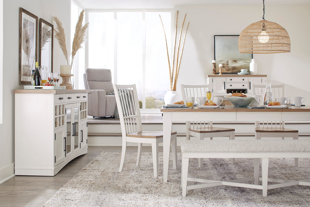 The 66-inch Buffet Server is a versatile and stylish piece that is perfect for your dining and entertaining needs. with its fresh hand-painted Cotton finish and contrasting Weathered Natural top, it offers timeless charm that is sure to impress. The solid-metal custom hardware in and authentic Burnished Bronze finish adds and extra touch of elegance to the design. This buffet server also features and integrated, Dual AC Power Center, making it easy to keep electric appliances close at hand. The three-way touch lighting illuminates your favorite display items and the glass-center doors add sophistication while highlighting the interior contents. A removable storage rack is perfect for wine bottle display, and the three storage drawers, featuring ball bearings for smooth opening and closing and English dovetail joinery for added strength and durability, are perfect for storing dining and entertaining essentials. This buffet server is a classic design that will work with or without coordinating hutch options. The authentic Quartz top insert provides a perfect surface for food preparation and serving, making it the ideal choice for your dining room or kitchen.