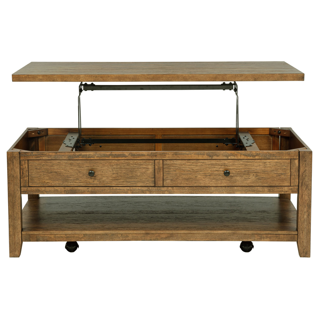 Blending versatility and warmth, this lift-top coffee table brings function and charm to everyday living. Its clean, structured silhouette is elevated by a spacious tabletop that rises for dining or work, while interior storage keeps essentials neatly tucked away. A wide lower shelf adds room for display or baskets, and built-in casters ensure effortless mobility. Crafted from pine, veneer, and engineered wood, it offers grounded style with everyday flexibility. Key Features: • Lift-top coffee table with concealed storage and lower shelf for flexible organization • Distressed brown finish reveals warm wood grain with a classic rustic tone • Top surface lifts for dining or laptop use, then lowers smoothly into place • Built-in casters provide seamless mobility for rearranging or cleaning • Black hardware adds a touch of contrast to the rich wood finish • Crafted from pine, pine veneer, and engineered wood for lasting strength