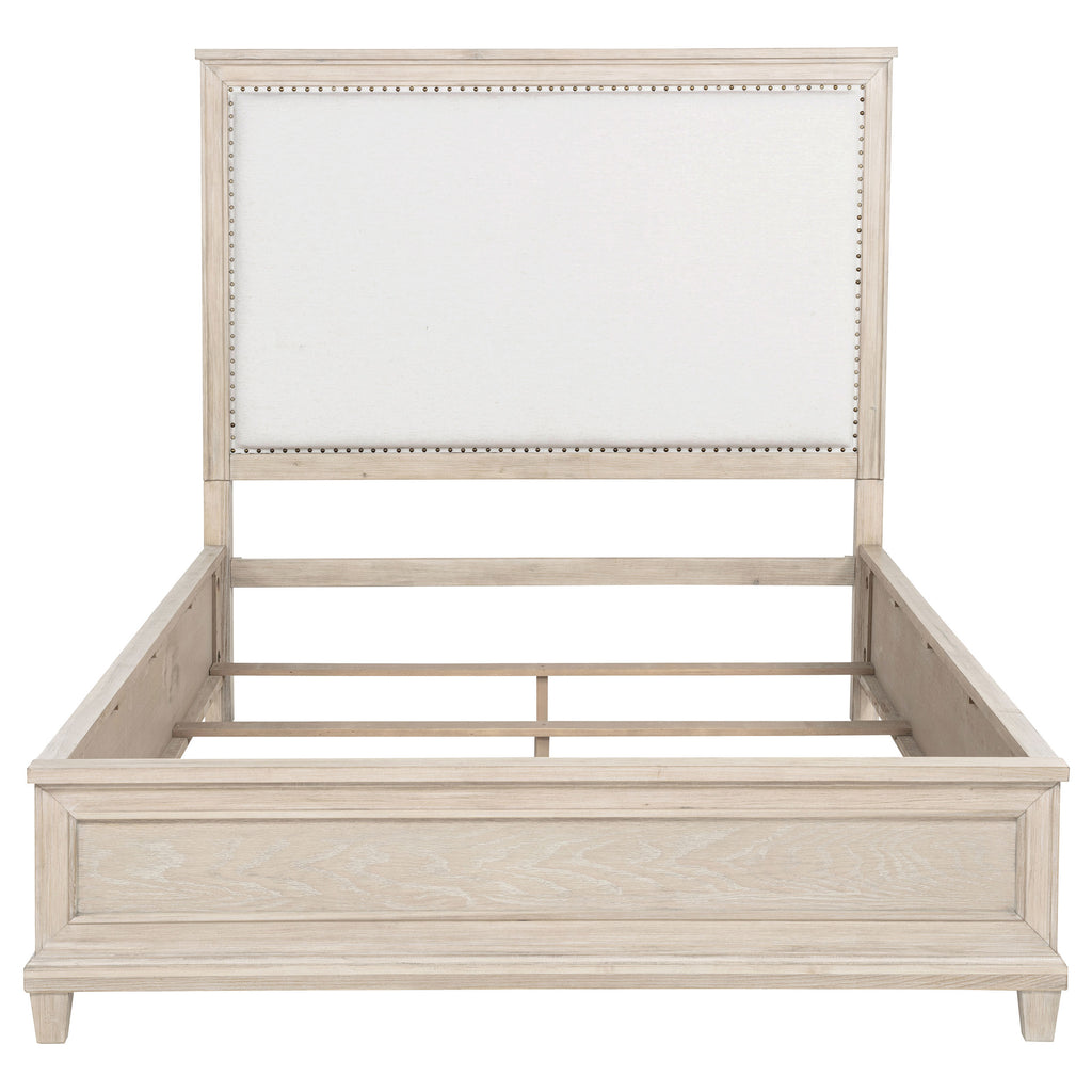 A quiet invitation to rest, this panel bed evokes the calm of coastal mornings and the grace of timeless design. Its tall headboard, wrapped in creamy fabric and framed by washed oak, offers a gentle contrast of texture and tone. A delicate row of nailhead trim glimmers like a finishing touch, while raised panel detailing at the footboard adds poised refinement. Crafted with care from oak veneer, poplar, and soft upholstery, this bed brings serenity and structure to the heart of the bedroom. Key Features: • Queen panel bed with cream upholstered headboard and tailored nailhead trim • Washed oak frame brings soft wood grain texture and coastal-inspired warmth • Tall headboard design adds graceful height and timeless visual impact • Raised panel footboard enhances structure with classic architectural detail • Requires foundation beneath mattress for complete support • Crafted from poplar, engineered wood, oak veneer, and fabric for lasting elegance