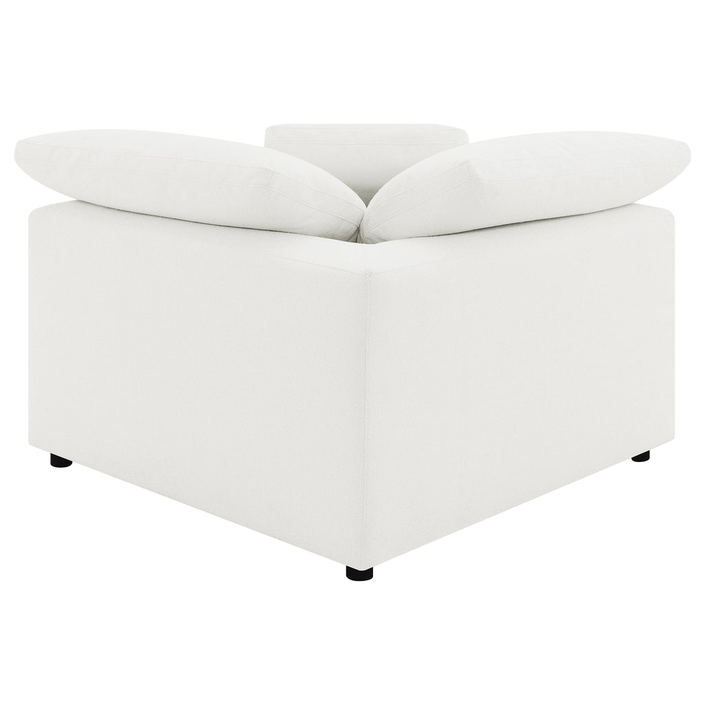 Center your relaxed living space on a modern five-piece sectional sofa, taking a laid-back approach to seating. This sofa, upholstered in tailored water-resistant boucle performance fabric with topstitch details, offers a refined, contemporary style in a neutral hue, perfect for any inviting living room. Customize your seating space with modular options, allowing you to create the perfect lounging environment. The plush, feather blend filled cushions will leave you motionless in ultimate comfort, as if wrapped in airy, cloud-like seating. Wide track arms add structure to the low slung silhouette, while an included ottoman encourages relaxation and round legs provide excellent support, complete with plastic glides to protect your flooring.