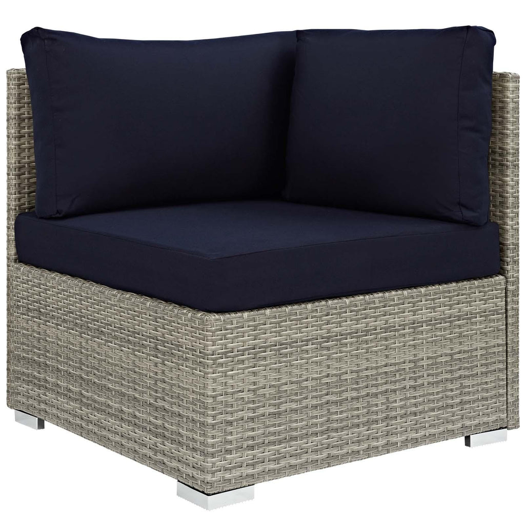 Enjoy the outdoors while benefiting from style and comfort of the Repose Outdoor Patio Furniture Series. Repose Patio Corner Sofa Chair offers a detailed tan and gray synthetic rattan weave with UV protection for eye-catching appeal and durability, plush 4� thick all-weather polyester cushions using industry-leading Sunbrella� fabric, non-marking foot pads, and a sturdy powder-coated aluminum frame that supports up to 331 pounds. Subtle style defines the Repose outdoor sectional collection making it a natural choice for enhancing your patio, backyard, or poolside gatherings. This installment of the series is a patio corner sofa chair.
