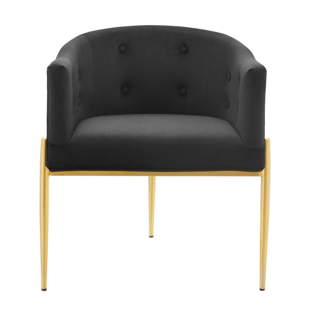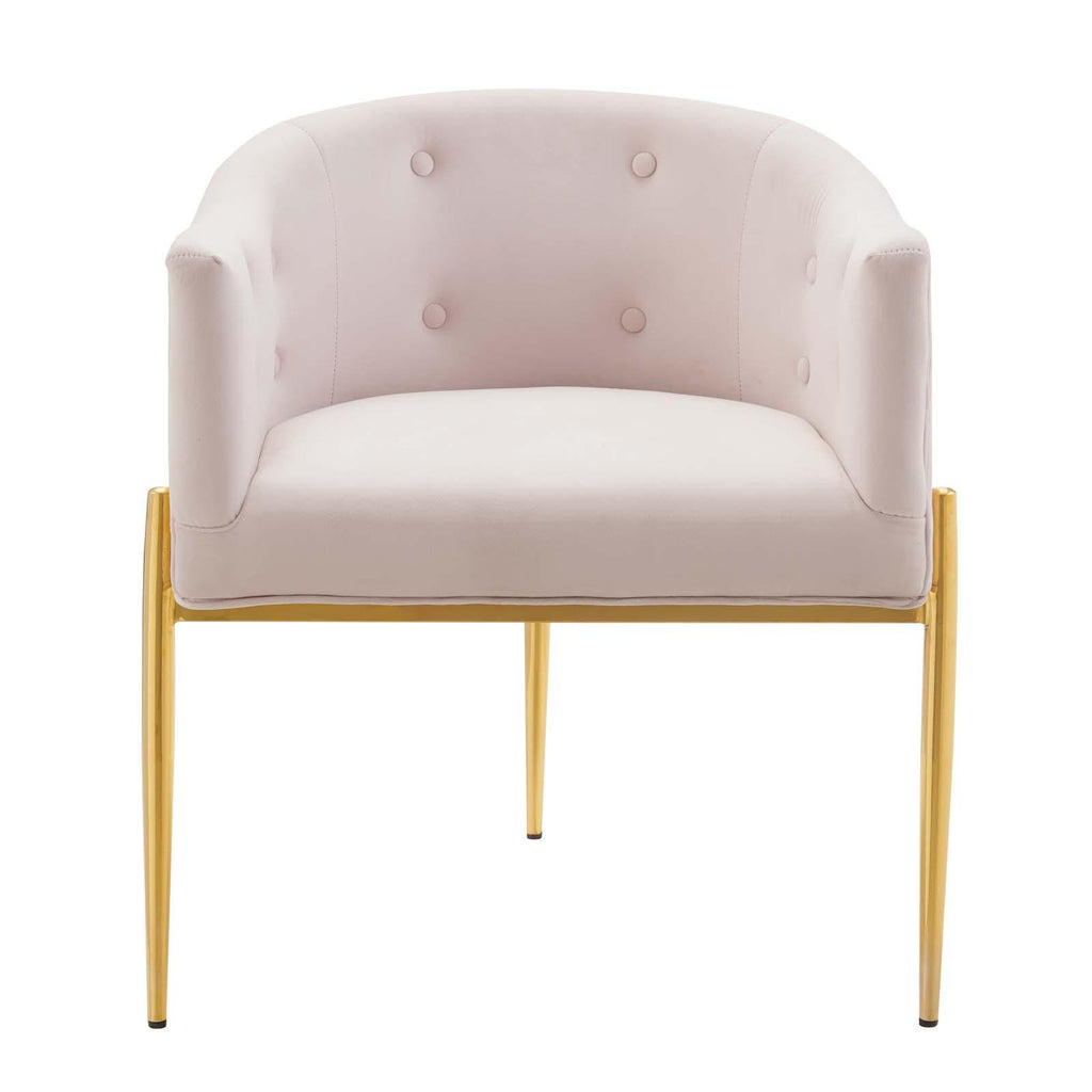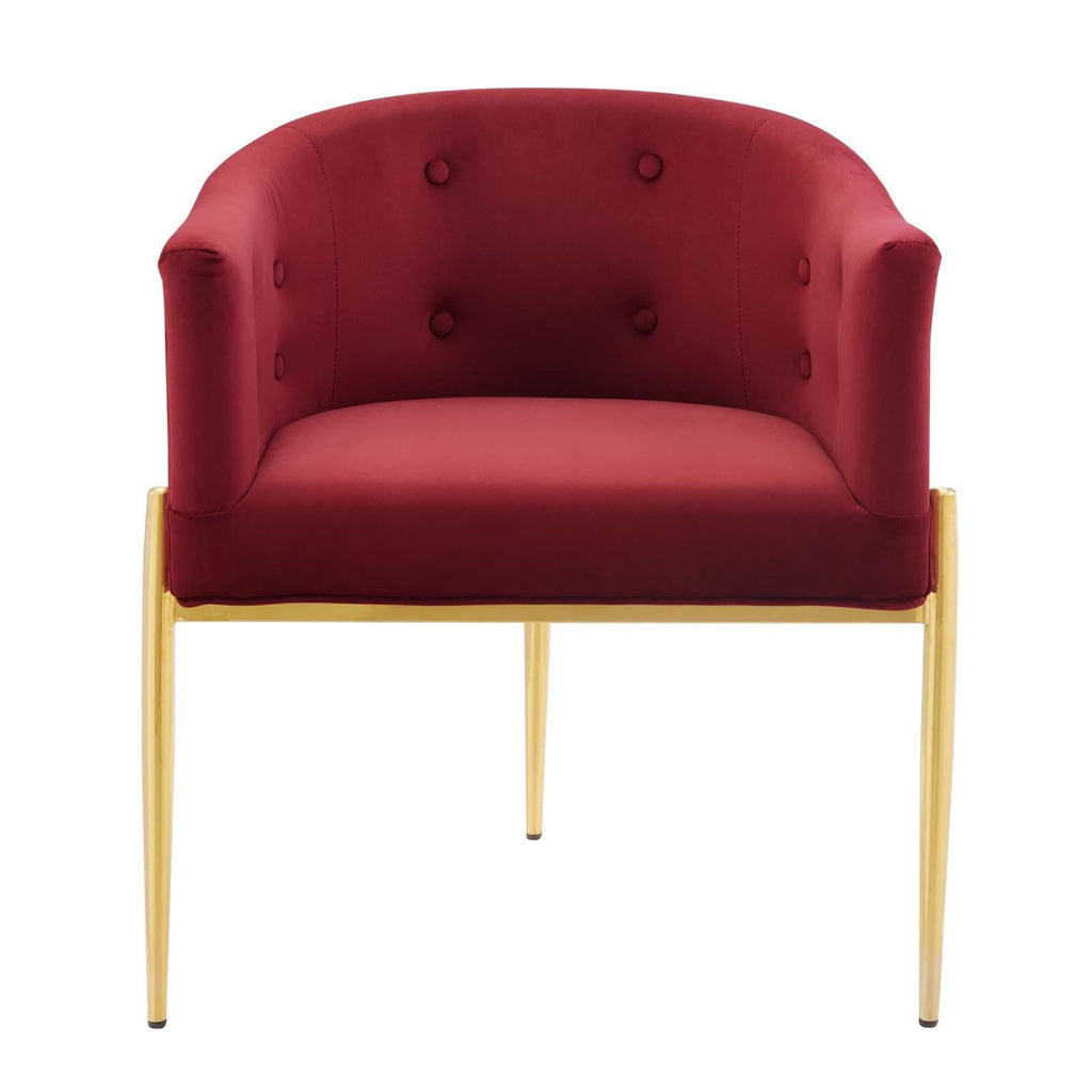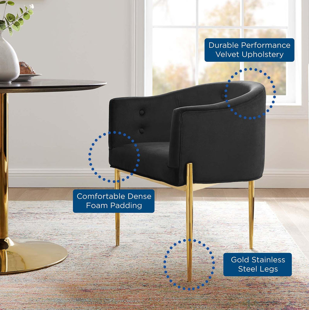 Bring luxe elegance to your living space or dining room with the Savour Tufted Performance Velvet Accent Armchairs. Featuring a sweeping silhouette and updated club chair design, this velvet chair set of two is suited for the dining table or living room, entryway, bedroom, or office as an accent chair. These accent chairs are upholstered in stain-resistant performance velvet upholstery and feature dense foam padding to offer a comfortable seat while dining, working, reading, or relaxing. Resting on chrome gold stainless steel legs, this versatile accent chair set has interior button tufting and a charming curved shape. Chair Weight Capacity: 300 lbs.