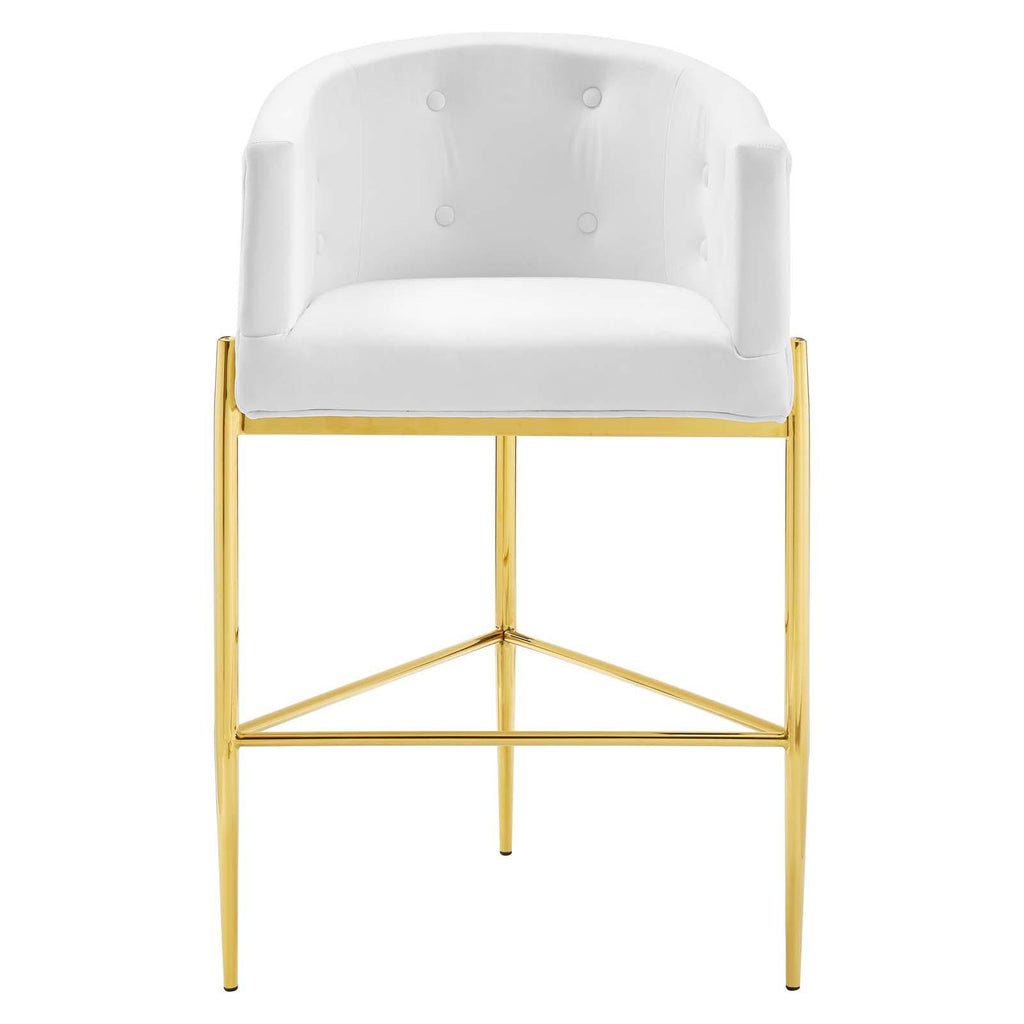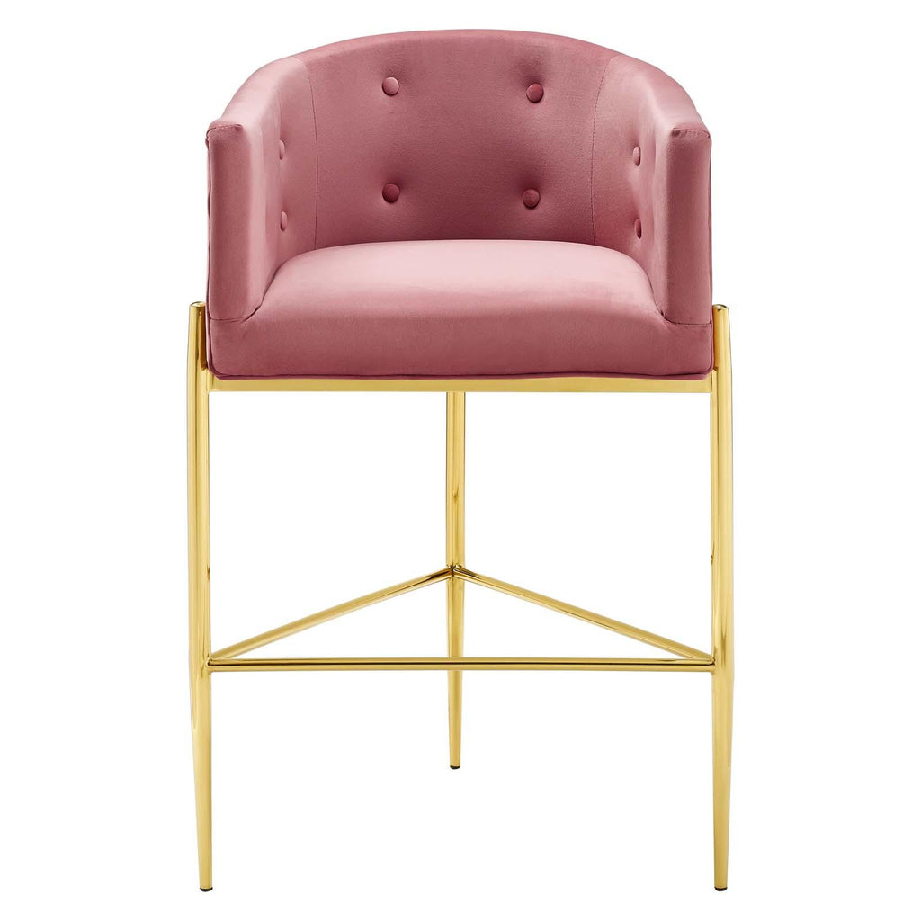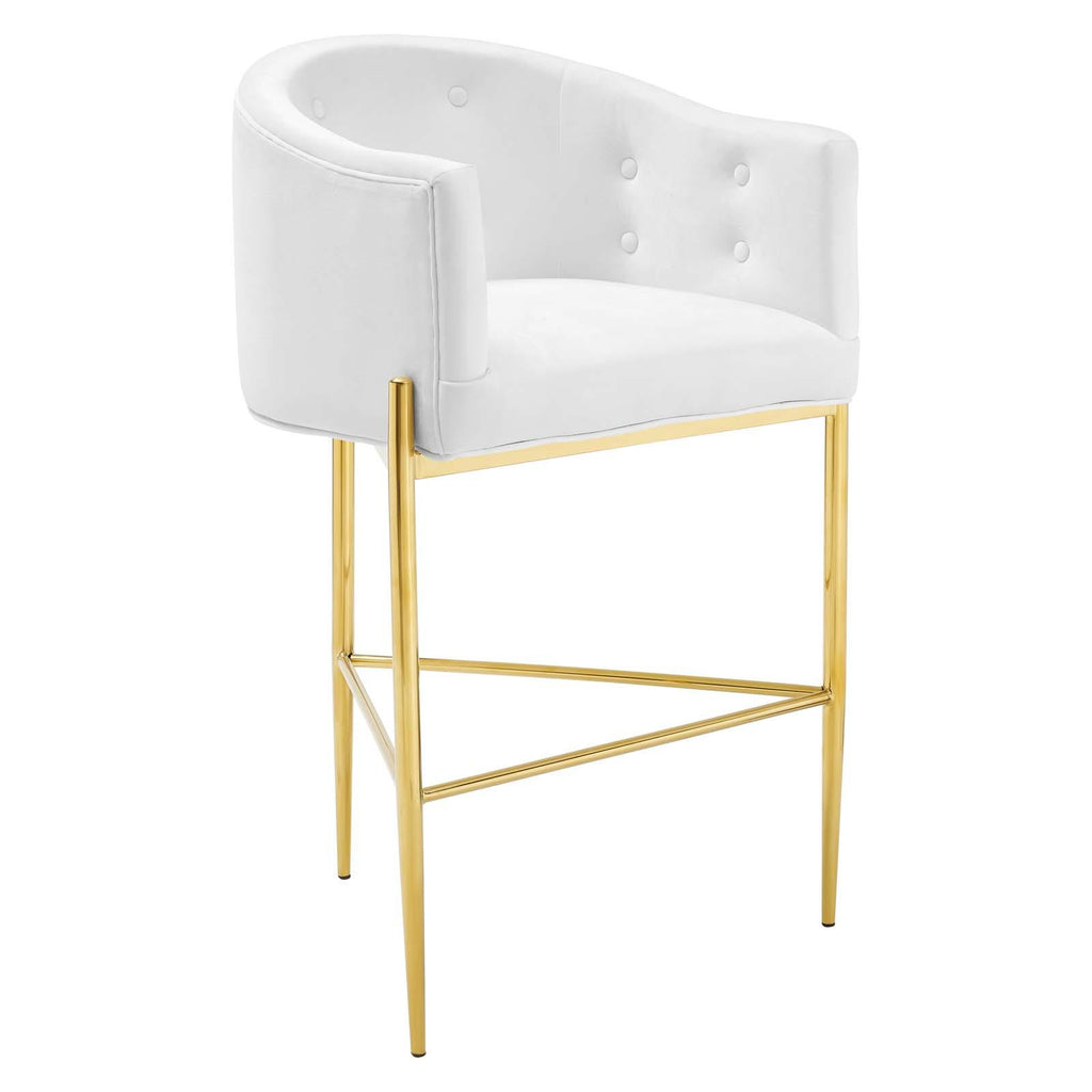 Bring luxe elegance to your dining room or kitchen space with the Savour Tufted Performance Velvet Bar Stool. Featuring a sweeping silhouette and updated club chair design, this velvet bar stool is suited for a pub table or kitchen counter. This stool is upholstered in stain-resistant performance velvet upholstery and features dense foam padding to offer a comfortable seat while dining. Resting on a chrome gold tubular stainless steel frame, this versatile bar stool has interior button tufting and a charming curved shape. Bar Stool Weight Capacity: 300 lbs. Seat Height From Floor: 29"