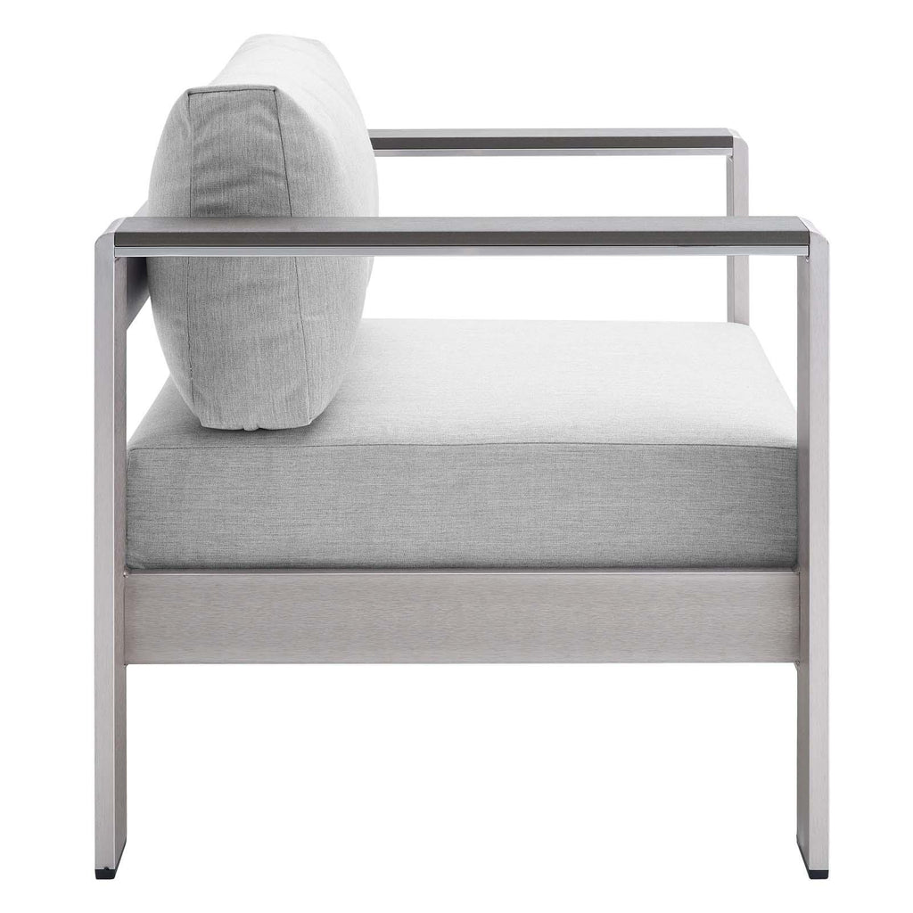 Enjoy your patio or backyard leisure time with the strong and durable Shore Outdoor Patio Aluminum 7 Piece Sectional Sofa Set. Made with anodized brushed aluminum frames and non-marking black plastic foot caps, Shore comes outfitted with resilient Sunbrella� fabric canvas cushions tested to last through all weather conditions. The Shore Outdoor Sectional Sofa Set complements your casual gatherings with a look and functionality you can rely on. Set Includes: 1 Left-Arm Sofa, 1 Right-Arm Sofa, 3 Armless Chairs, 2 Armchairs