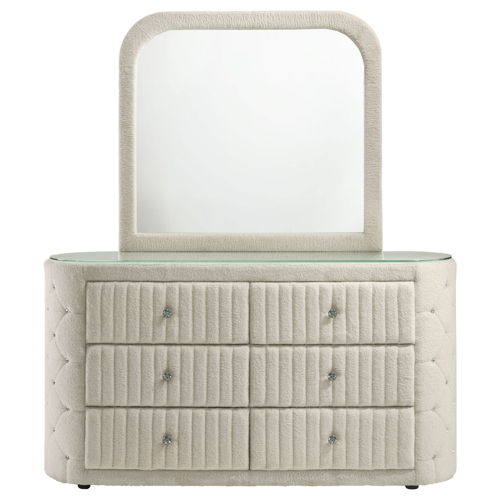 Wrapped in a cloud of boucle and gleaming detail, this dresser and mirror set transforms any bedroom into a personal sanctuary. Diamond tufting along the sides sparkles with embedded crystal accents, while vertical channeling on each drawer adds tailored rhythm and depth. Topped with a sleek mirror framed in matching fabric, the design offers a romantic balance of softness and structure, inviting both elegance and indulgence into everyday routines. Key Features: • Dresser and mirror set features plush boucle upholstery in a soft ivory tone throughout • Six drawers with vertical channeling offer bedroom storage and refined visual texture • Diamond-tufted sides embellished with crystal-style accents elevate the glam appeal • Clear tempered glass top offers a smooth, durable surface that enhances the look • Framed mirror matches the upholstered silhouette for a cohesive bedroom presentation • Crafted from solid rubberwood, engineered wood, boucle fabric, and foam for longevity