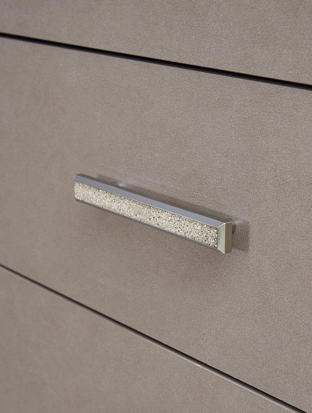Love sleek and bold contemporary style? Drink in the beauty of this dresser. Its eye-catching details include glam glitter accents and the look of leather grain with a subtle gray finish. Large-scale linear handles, in a sophisticated champagne chrome tone, play perfectly with the streamlined aesthetic. This storage piece is a simply stunning way to achieve the bedroom of your dreams.