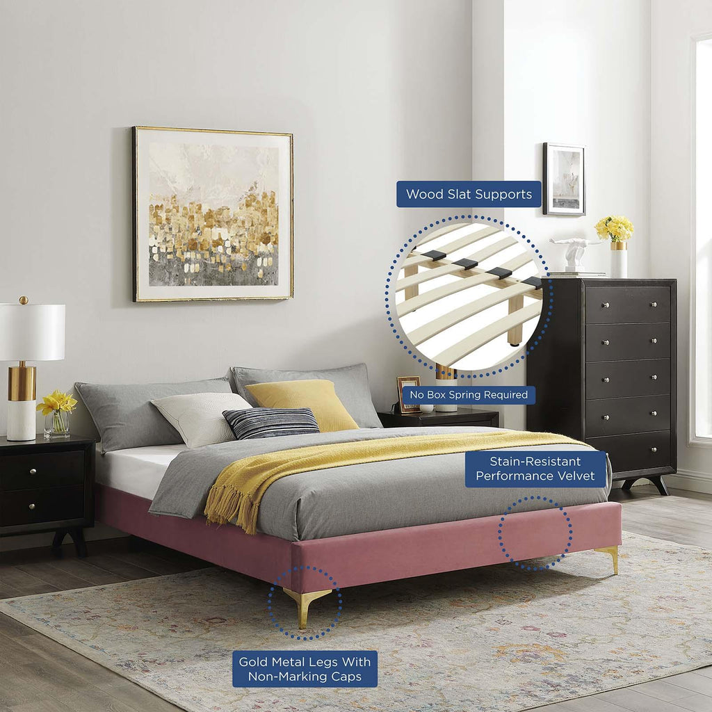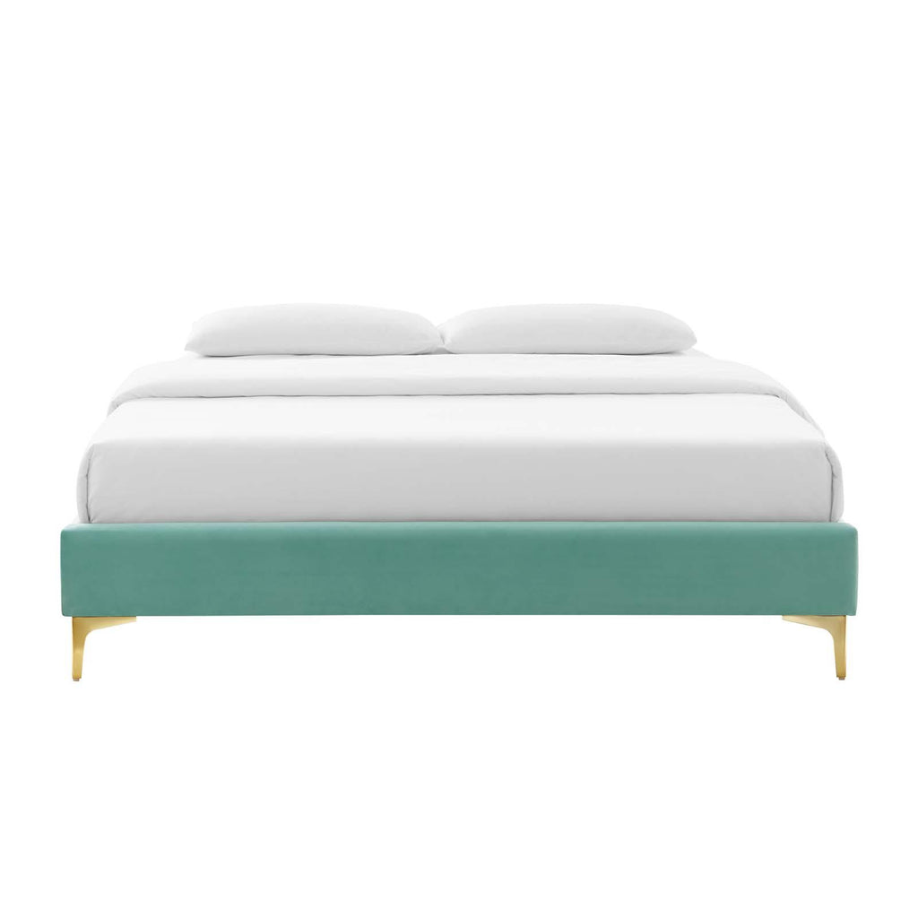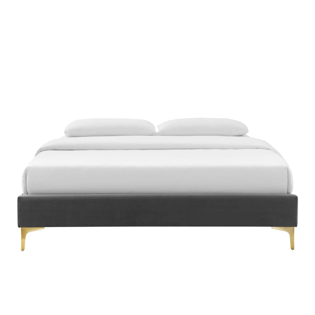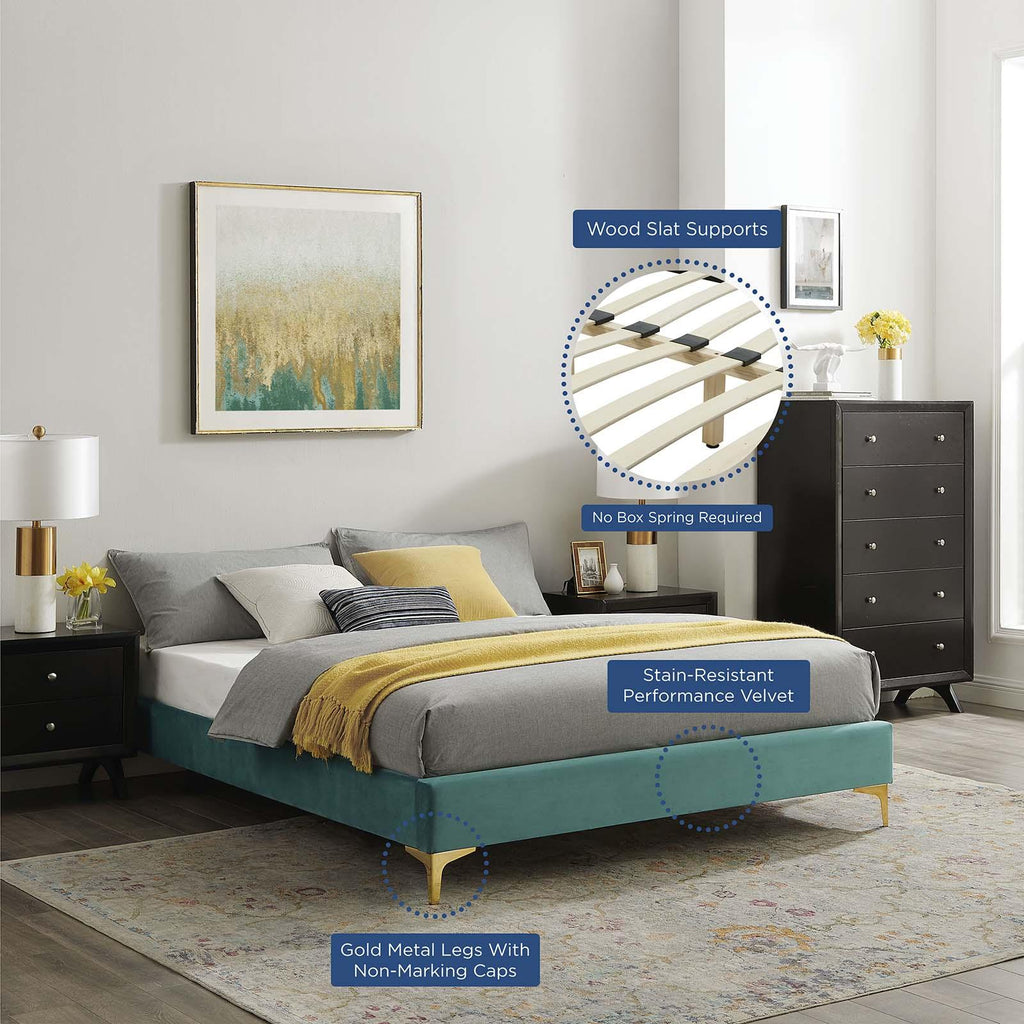 Uplift your master bedroom or guest bedroom decor with the Sutton Performance Velvet King Bed Frame. A King size bed frame covered in stain-resistant performance velvet, this upholstered bed frame is a sturdy mattress foundation for memory foam, innerspring, latex, and hybrid mattresses. Eliminating the need for a box spring, the MDF frame of this King bed is complete with a wood slat support system crafted with poplar for lasting durability and support. This slatted bed frame rests on gold metal legs with non-marking foot caps and includes a reinforced center beam with two support legs for enhanced stability. The Sutton Bed Frame is compatible with a variety of different headboard styles, or makes a statement as a stand-alone piece in the bedroom. Bed frame interchangeable with Paige, Alyson, Angela, Veronique, Evelyn, Dawn, Cecilia, Lucia, Rosalind, Delilah, Greta, Louisa, Eloise, Daisy, Sadie, Sloane, Fallon, and Lizzy. Mattress not included. Assembly required. King Size Bed Frame Weight Capacity: 800 lbs.