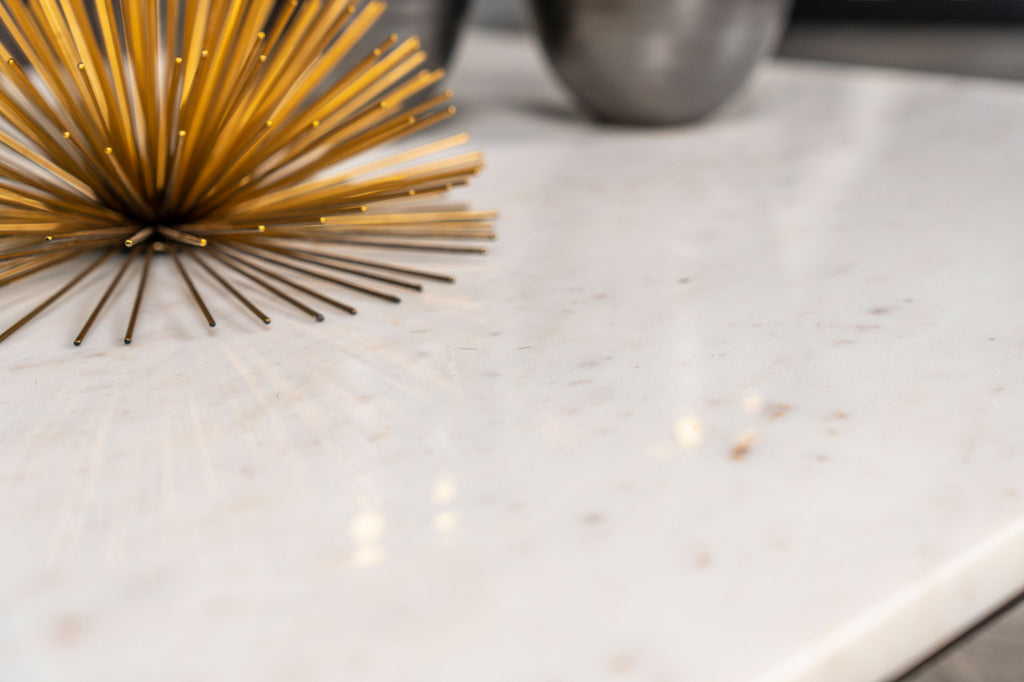 An attractive square shape begins the design path of a glam-inspired coffee table toned down with a hint of industrial style. Turn a casual or semi-formal living room or family room into a gallery of architectural and artisan design. Start with a coffee table featuring a bold black finish metal frame in a crisscross shape. A chic marble top offers a blend of white tones and gray touches, versatile and decadent. This cocktail table features straight edges and a dissected-angle design adding optical energy. Key Features: • Square coffee table designed with a sleek modern silhouette and clean geometric lines • Genuine white marble top with gray veining offers timeless elegance and durability • Sturdy black powder-coated solid metal base ensures strength and lasting stability • Crisscross base design creates bold architectural interest and modern appeal • Straight edges and intersecting frame angles add dynamic optical energy • Perfect accent piece for glam, industrial, or minimalist living room spaces