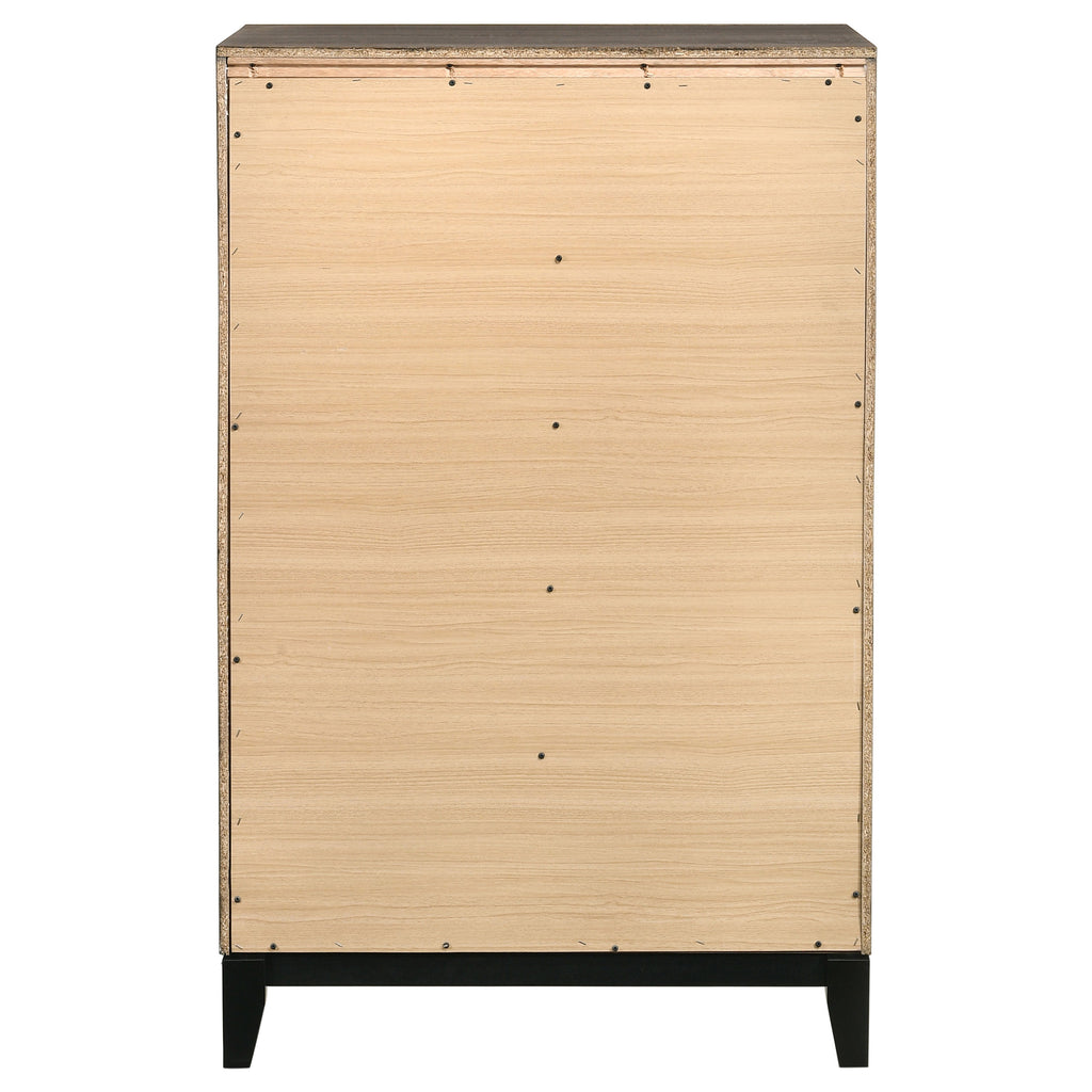 Complete a retro motif with the fine details and color blocking from this grey five-drawer chest. Constructed of oak, the body showcases a light, exposed wood grain that oozes sophistication. Tapered legs in a black finish offer a modern feel, adding visual intrigue with neutral hues. Bright and metallic, light drawer pulls curve off the flat drawer fronts in a half moon shape. A contemporary take on mid-century modern design, add fun flair to an up-to-date scheme. Key Features: • Transitional style bedroom at a great value • Nickel finished hardware highlights two-tone grey oak finish • Black grooves create a dimensional look • Three-dimensional engineered foil paper veneer in grey oak and black • English dovetail drawer construction • Black finish legs are crafted of solid hardwood